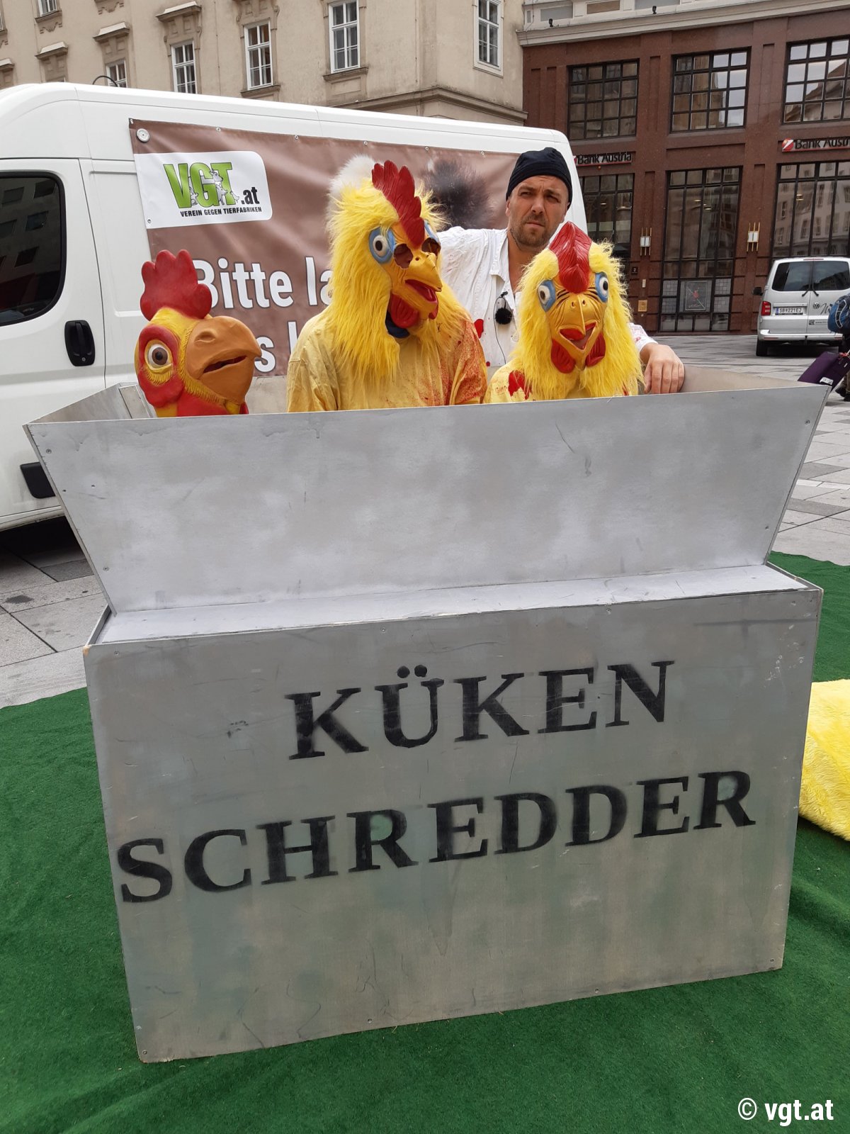 Jährlich werden in Österreich über 9,5 Millionen* Hahnenkücken am Tag ihrer Geburt aussortiert und vergast oder zerhäckselt. Sie können keine Eier legen und sind daher für die Eier-Industrie wertlos. Als Legerasse setzen sie auch nicht genug Fleisch an, um als Masttiere verwendet zu werden. Diese erschreckende Zahl an sogenannten Eintagskücken steigt jährlich an. Der VGT machte heute mit einer Medienaktion auf das Leid dieser Tiere aufmerksam. Dabei wurde ein überdimensionaler Kückenschredder am Stephansplatz aufgebaut. Ein als Schlachter verkleideter Tierschützer stopfte als Kücken verkleidete Aktivist_innen in den Schredder, untermalt wurde das Schauspiel von Motorengeräuschen und Kücken-Gezwitscher.