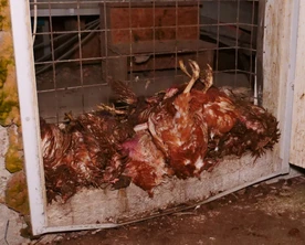 sogar noch vor diesem Zeitpunkt an Krankheiten und Schwäche. Wenn die toten Tiere gefunden werden, wirft man sie auf Haufen zusammen. Viele Kadaver verwesen aber auch mitten unter den anderen Hühnern.