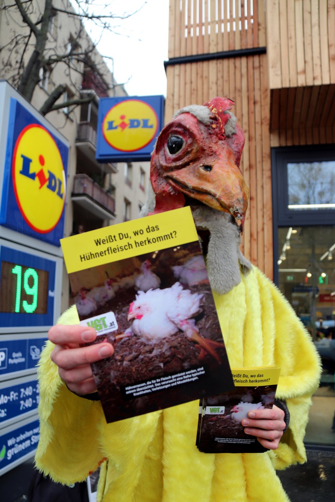 Nachdem die vom VGT veröffentlichte Aufdeckung eines österreichischen Masthuhn-Betriebs am Dienstag und Mittwoch durch alle Medien schnellte, protestieren heute VGT-Tierschützer:innen vor einer Lidl Filiale in der Tivoligasse in Wien. Die Aktivist:innen kritisieren den Einsatz von Qualzuchten und zeigen den internationalen Charakter der Problematik auf. Die Veröffentlichung ist die vierte innerhalb weniger Monate. Ein Netzwerk internationaler NGOs bittet den Discounter Lidl europaweit, sich der Europäischen Masthuhn-Initiative anzuschließen.