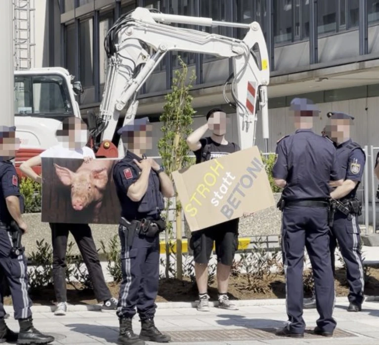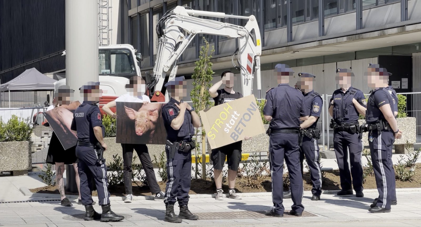 demonstrieren. Das geschah zwar nicht, vielmehr befand sich dort lediglich ein Infostand, an dem die Besucher:innen des Bundesparteitages Informationen überreicht bekamen, doch die Behörde untersagte dem VGT jegliche Kundgebung im Umkreis von 50 m zum gesamten Vorplatz, obwohl dort kein Mensch war. Nachdem eine Dreiviertelstunde lang niemand von der ÖVP am Vorplatz erschien, stellten sich dort 3 kritische Tierschützer:innen mit Plakaten gegen die Schweinehaltung auf Vollspaltenboden hin, um eine Spontanversammlung abzuhalten. Die Polizei löste daraufhin diese Versammlung auf und vertrieb die Tierschützer:innen mit der Begründung, dass dort ja eine – zwar inexistente aber angemeldete – Demo der ÖVP stattfinden würde. Dagegen richtete sich die Maßnahmenbeschwerde und das Landesverwaltungsgericht Steiermark gab den Tierschützer:innen gestern recht: die Auflösung war rechtswidrig.