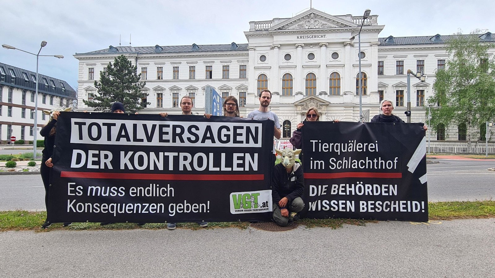 Vor Gericht entbrannte eine Diskussion zwischen Amtstierärzt:innen der zuständigen BH und der Gerichtssachverständigen darüber, ob Schafe überhaupt manuell auf diese Art fixiert und geschächtet werden dürfen. Zitiert wurde die EU-Schlachtverordnung, in der für Wiederkäuer (z.B. Rinder oder Schafe) mechanische Fixierungen bei der Tötung vorgeschrieben sind. Diese seien laut Amtstierarzt, der den Bescheid für die Schächtungen im Betrieb im Vorfeld ausgestellt hatte, aber nicht üblich. VGT-Campaigner David Richter dazu: Es wird in diesem Prozess deutlich, dass eine tatsächlich gesetzeskonforme rituelle Schlachtung von Schafen ohne mechanische Fixierung nicht möglich ist. Das heißt: Entweder werden die Gesetze verbogen und gebrochen oder die Schächtungen dürfen nicht mehr genehmigt werden!