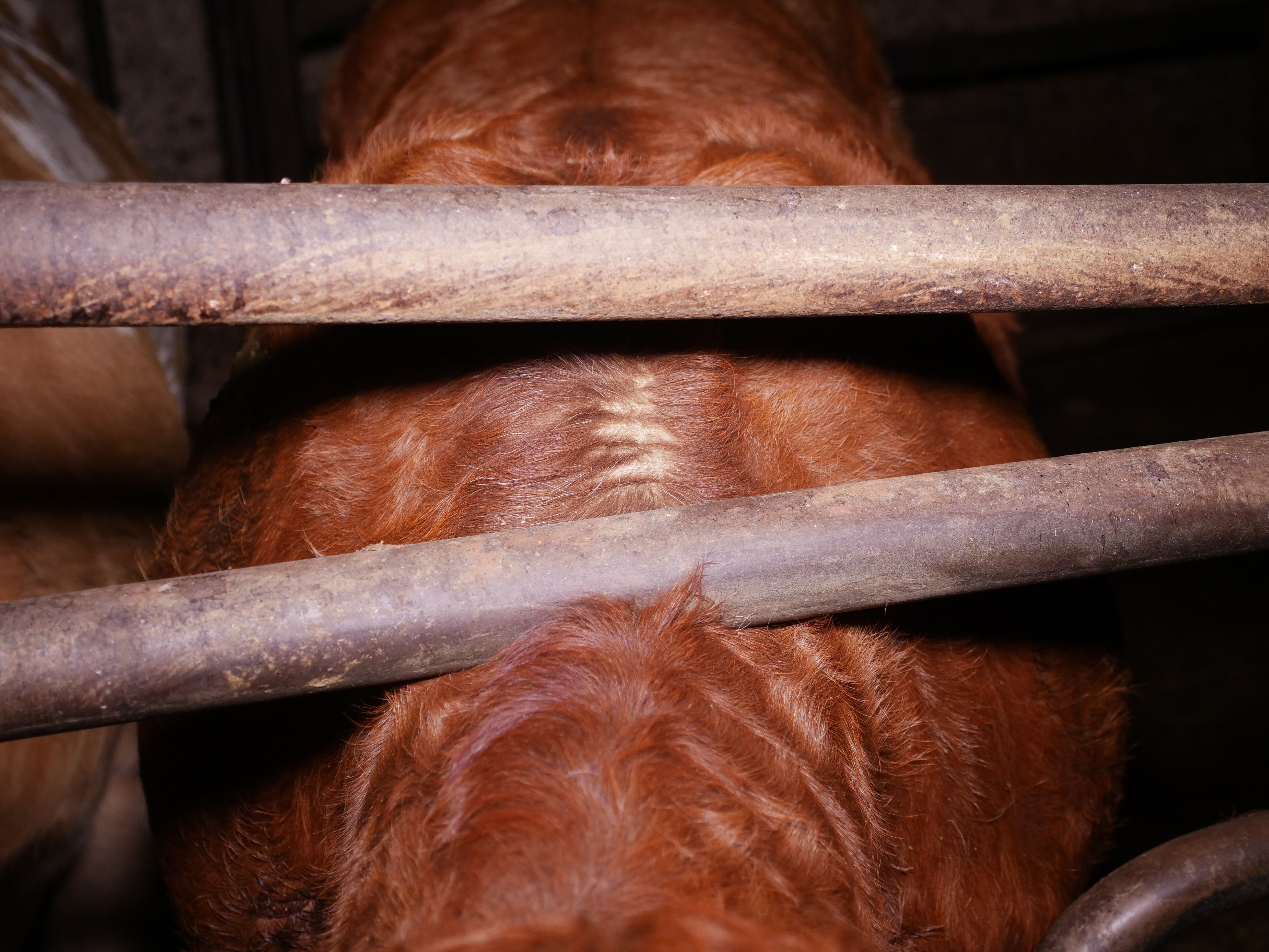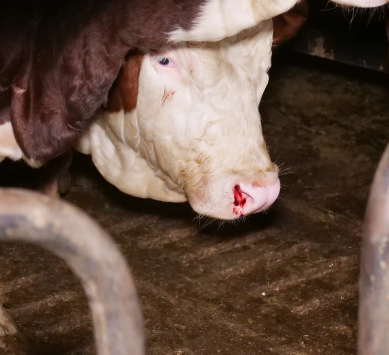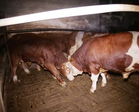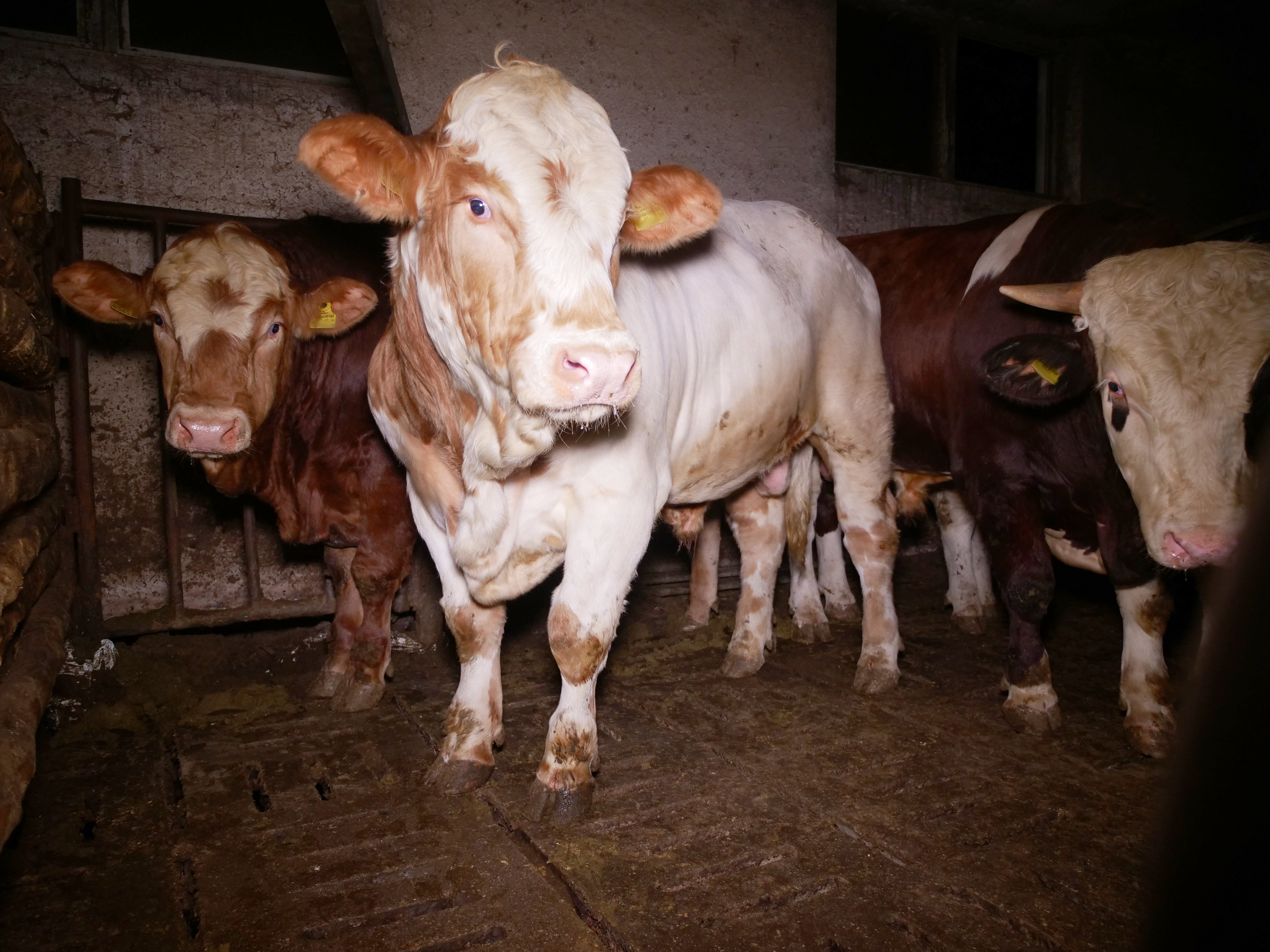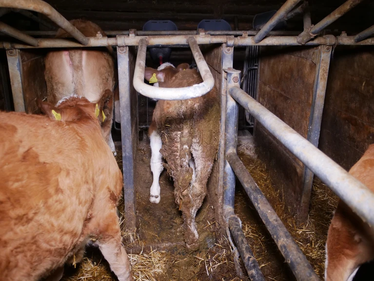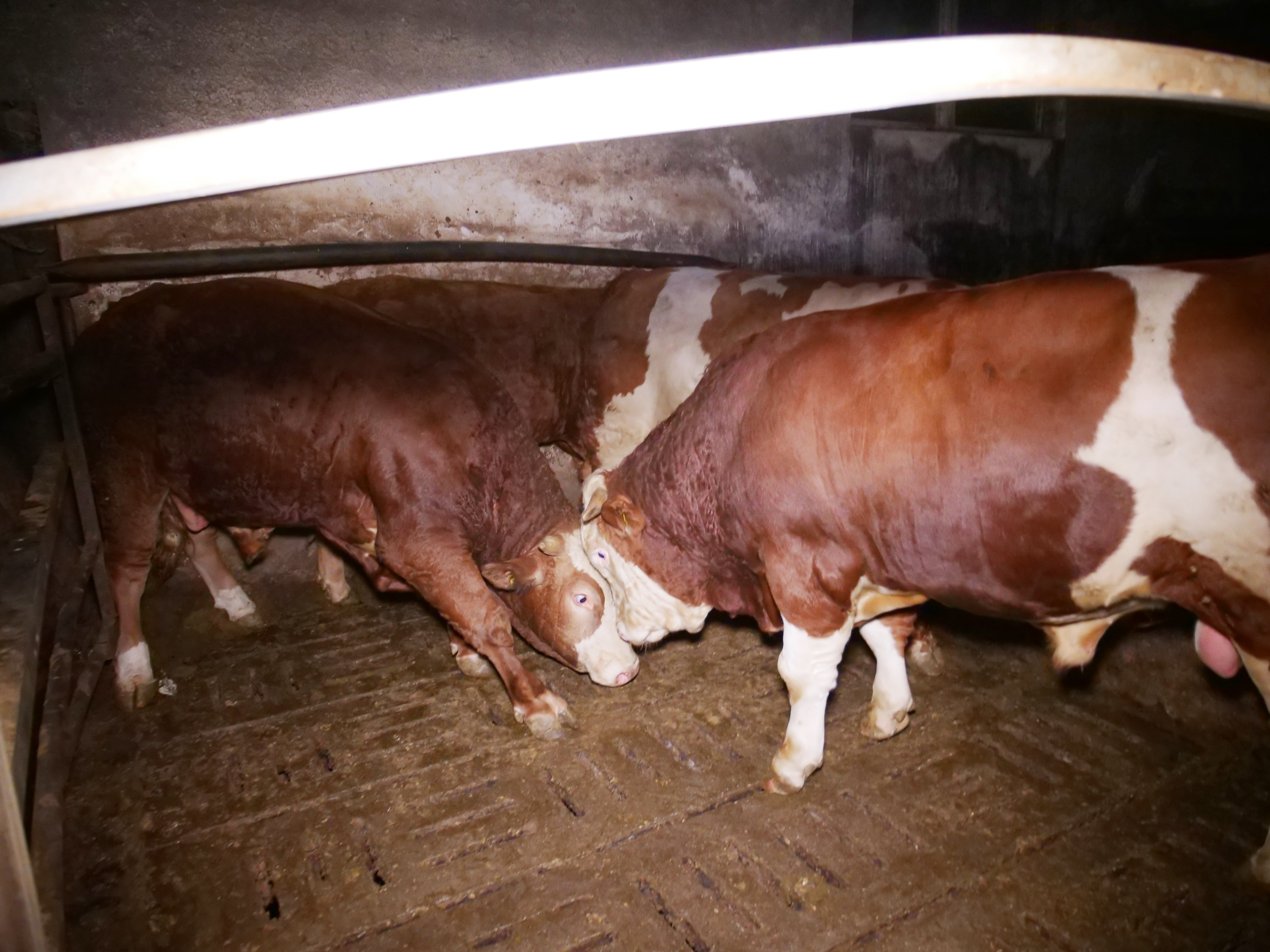 Dicht gedrängt stehen die großen Maststiere in den Buchten – auf Vollspaltenboden aus hartem Beton. Die Tiere stoßen sich gegenseitig, ein Rind blutet aus der Nase. Auslauf gibt es für diese Masttiere nicht. Die Rinder, die hier für die Fleischproduktion gemästet werden, stehen beispielhaft für zigtausende Mastrinder in Österreich, die auf Vollspaltenboden leben müssen. Teile des Stalls sind stark verdreckt. Die Haltung auf dem harten Vollspaltenboden belastet die Gelenke und ist keineswegs artgerecht.