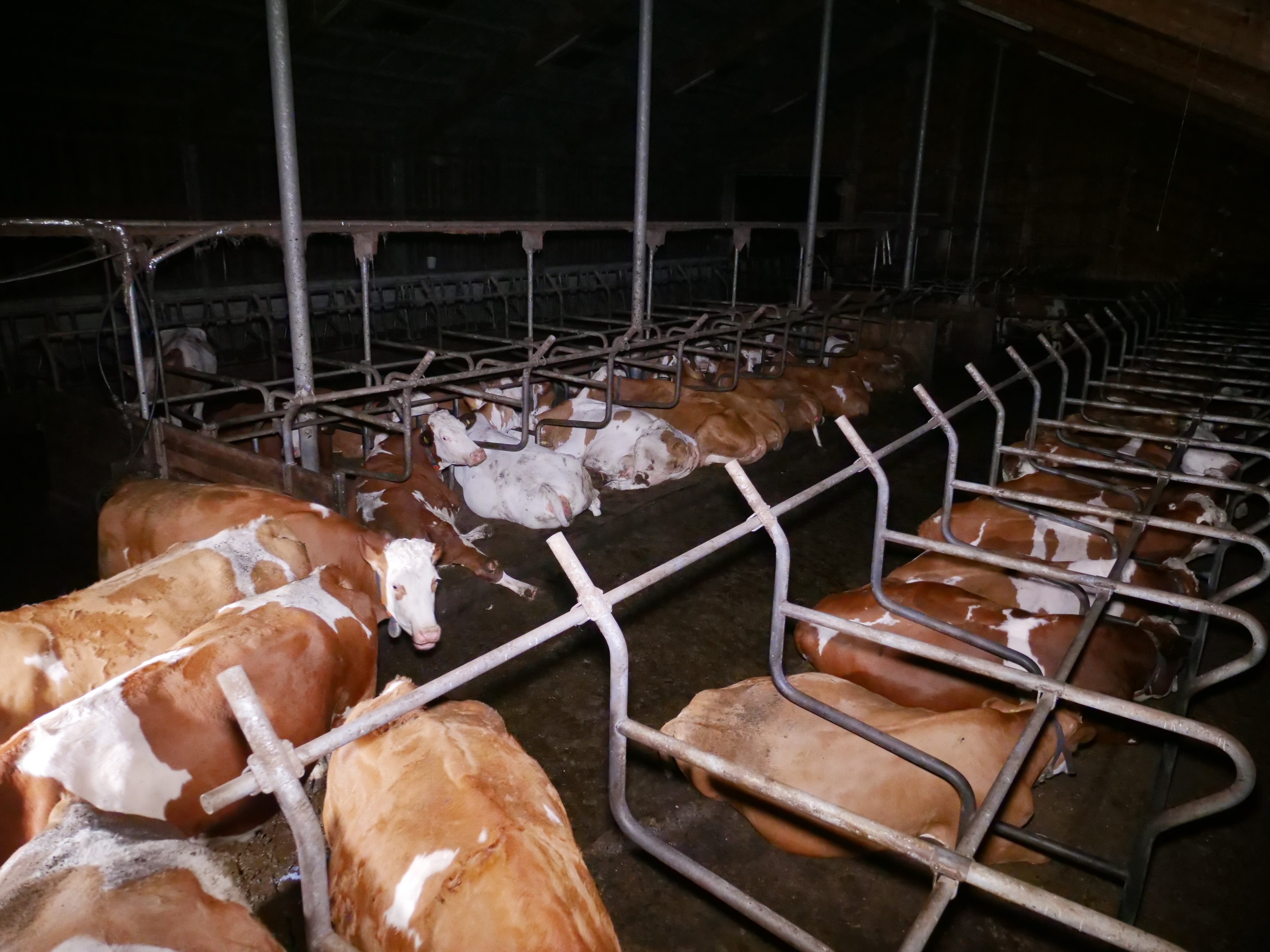 Im aufgedeckten Betrieb werden auch Milchkühe und Kälber gehalten. Auch bei den Milchkühen ist Spaltenboden verbaut. Zwar gibt es Liegeflächen ohne Spalten – die minimale Gummiauflage kann aber keinesfalls eine weich eingestreute Liegefläche ersetzen. Auch hier müssen die Rinder hart liegen. Der Spaltenboden ist stark verschmutzt und offensichtlich sehr rutschig, wie die Videoaufnahmen, die dem VEREIN GEGEN TIERFABRIKEN von anonymen Tierschützer:innen zugespielt wurden, zeigen.