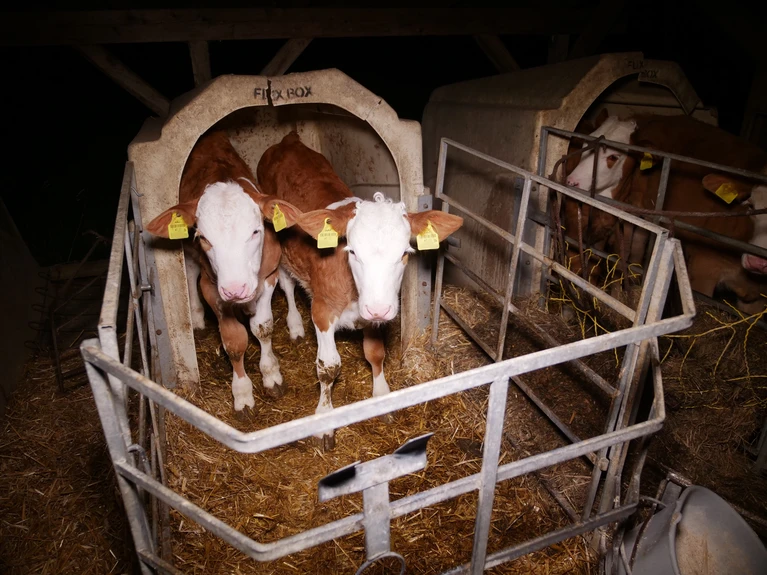 Jedes Jahr müssen Milchkühe Kälber gebären, um die Milchleistung zu maximieren. Weibliche Kälber werden häufig für die Milchproduktion weitergenutzt. Männliche Kälber werden für die Fleischproduktion gemästet. Die Maststiere im ersten Stallbereich sind die Söhne der Milchkühe im Betrieb – die Milch- und Fleischproduktion hängen direkt zusammen.
