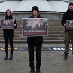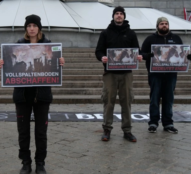 Die Bilder und Videos aus den beiden Betrieben mit Rindern auf Vollspaltenboden in NÖ schockieren. Und zwar schockieren sie nicht, weil sie etwas Illegales zeigen. Sie schockieren gerade deshalb, weil sie den erlaubten Standard in 70 % der Mastrinderhaltungen Österreichs zeigen. Das Schockierende ist der moralische Skandal, dass wir als Gesellschaft verletzte Tiere, verkotete Böden und ein dichtes Gedränge erlauben. Und genau hier setzt die Verantwortung der Politik ein. Das ist keine Frage freier Konsumwahl. Niemand kann ernsthaft sagen, solange es Menschen gibt, die nach dem billigsten Fleisch greifen, muss es erlaubt sein, dieses Fleisch in einer Weise zu produzieren, dass praktisch 100 % der Tiere schwer leiden! Eine Haltung, die den Rindern routinemäßig schweres Leid zufügt, darf in einem Land mit Tierschutz als Staatsziel in der Bundesverfassung nicht zugelassen werden. Und haltungsbedingtes schweres Leid ist auch tatsächlich im Tierschutzgesetz verboten. Doch das Gesetz wird wieder einmal nicht exekutiert! Deshalb protestierten heute VGT-Aktivist:innen anlässlich der bevorstehenden Nationalratssitzung vor dem Parlament in Wien.