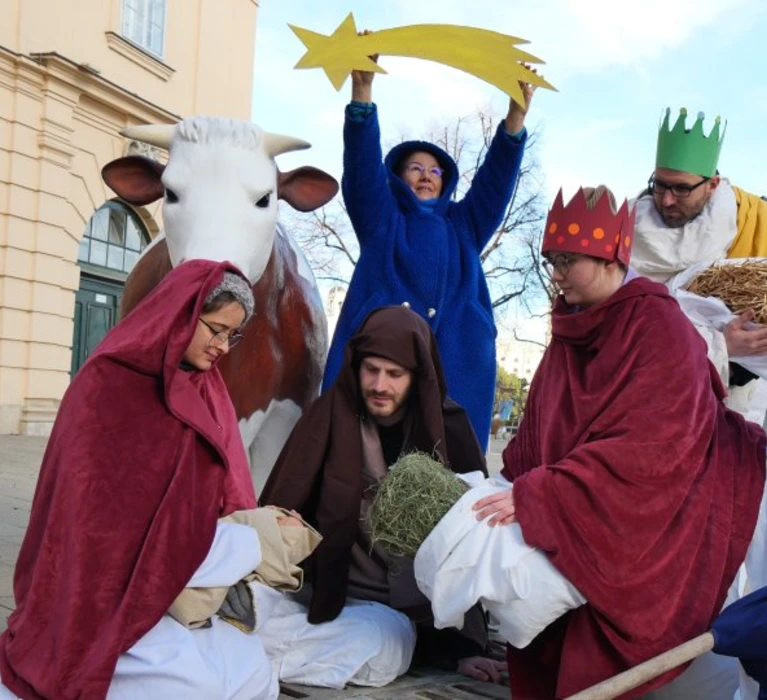 Auch wenn es nicht der christlichen Tradition entspricht, Tieren in Not zu helfen und tierquälerische Haltungsformen zu bekämpfen, so gibt es dennoch auch zahlreiche Texte einer Tierbefreiungstheologie, insbesondere von Univ.-Prof. Andrew Linzey in England, aber auch in Österreich, z.B. die Dissertation Gott der Tiere von Dr. Wolfgang Kimmel. Und im Sinne dieser Tierbefreiungstheologie ist es zweifellos legitim, auch Jesus in den Tierschutz einzubinden. War sein Geburtsort in der theologischen Tradition ein Stall, so muss das heute eine Vollspaltenboden-Tierfabrik sein. Und hat er von den Heiligen Drei Königen noch Gold, Weihrauch und Myrrhe erhalten, so wurde ihm heute von VGT-Aktivist:innen am Platz der Menschenrechte in Wien Stroh, Heu und ein Vorschlaghammer überreicht. Ersteres, damit die Rinder weich liegen, Zweiteres, damit sie artgerecht ernährt werden – in der Rindermast erhalten sie hauptsächlich Maissilage und Getreide – und Drittes, damit Jesus im Heiligen Zorn diese tierquälerischen Böden zertrümmern kann. Wissenschaftlich ist zweifelsfrei nachgewiesen, dass Mastrinder auf Vollspaltenboden extrem leiden, so haben 100 % der Tiere zumindest geringgradige Schäden des Vorderfußgelenks, 84 % sogar hochgradige.