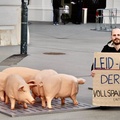 Vollspaltenboden Neu mit jeweils 5 lebensgroßen Schweinefiguren nebeneinander gestellt. Den Unterschied erkennt man nur nach genauer Inspektion. Auch Fotos aus Betrieben mit beiden Versionen des Vollspaltenbodens zeigen, dass sie im Wesentlichen dasselbe sind. Die 10 % mehr Platz, die am Vollspaltenboden Neu den Tieren geboten werden, bedeuten gerade einmal eineinhalb A4-Seiten für ein 85 kg schweres Tier. Auch diese fallen daher nicht auf. Deshalb das Transparent Leid-Kultur der ÖVP: Vollspaltenboden