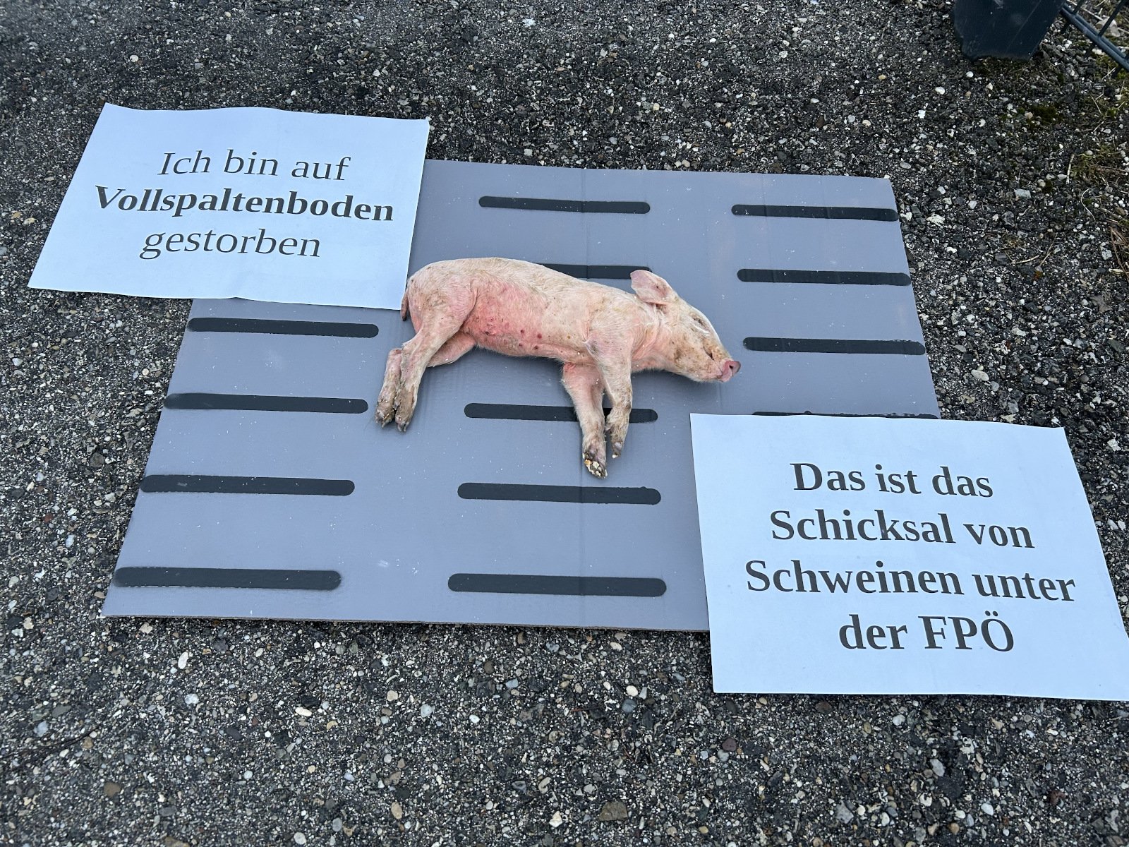gegen das Volk aufmerksam zu machen: ca. 700.000 Schweine sterben jährlich an ihren Haltungsbedingungen und werden in der Tierkörperverwertung entsorgt. Deshalb legten diese ein totes Schwein auf einen gemalten Vollspaltenboden vor die FPÖ-Zentrale in St. Pölten, Purkersdorfer Straße 38. Volkskanzler