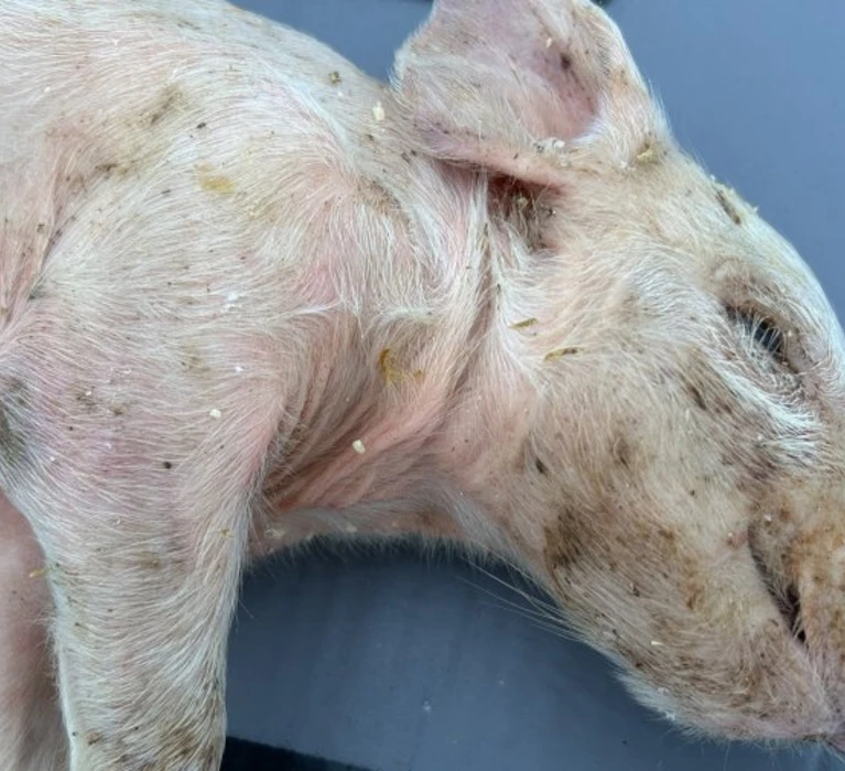 Dem VGT zugespielte Fotos zeigen Schriftzüge „Auf Vollspaltenboden gestorben“ und „Das ist das Schicksal von Schweinen unter der FPÖ“ auf dem toten Schwein beigefügten Plakaten