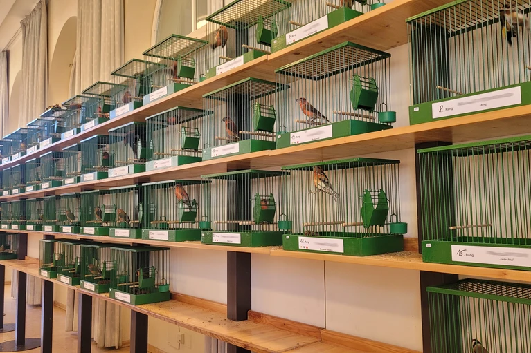 Der Vogel in seinem winzigen Gefängnis. Artgenossen sollen durch seine Anwesenheit angelockt werden, um gefangen und dann denselben schrecklichen Bedingungen ausgesetzt zu werden, wie er. Die gefangenen Vögel verbringen den Winter in Käfigen, was für die Wildtiere unheimlichen Stress bedeutet. Bei Ausstellungen werden sie präsentiert und prämiert.
