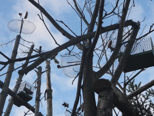 Auf diesem Bild sind als Lockvögel eingesetzte Kreuzschnäbel gut zu erkennen. Der Kreuzschnabel links ist rot und wurde laut Angabe des Fängers erst zwei Wochen zuvor gefangen. Der Kreuzschnabel rechts ist gelb und bereits ein Jahr in Gefangenschaft. Um die Gegebenheiten für den Vogelfang zu optimieren, wird eine künstliche Umwelt geschaffen. (Bild von 2005)