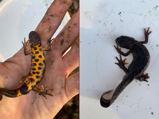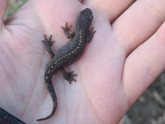 Einer der drei Molche, die hier vorkommen. Erkennbar sind sie an der dunklen Farbe und dem orangen Bauch.