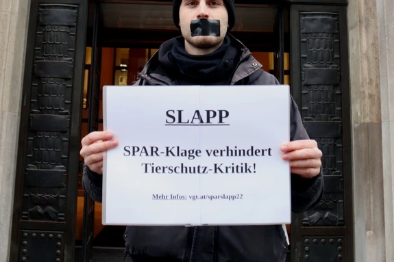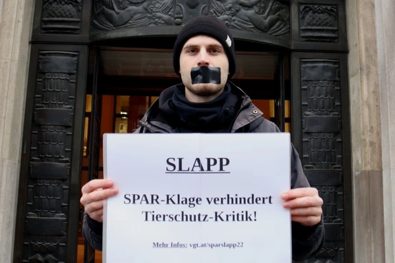 Dagegen klagte SPAR im Juli 2022 und wollte ein Gerichtsurteil erreichen, dass der VGT diese Proteste grundsätzlich unterlassen muss, wobei Prozesskosten in der Größenordnung von € 100.000 drohen. Die Klage umfasste die Behauptung, man dürfe SPAR nicht für das Schweineleid auf Vollspaltenboden verantwortlich machen, der VGT dürfe das Logo nicht verwenden und der VGT sei nach dem Verbot unlauteren Wettbewerbs als wirtschaftlicher Konkurrent zu sehen, weil die Kritik an SPAR gleichzeitig implizit einer Bewerbung anderer Supermärkte gleichkäme.