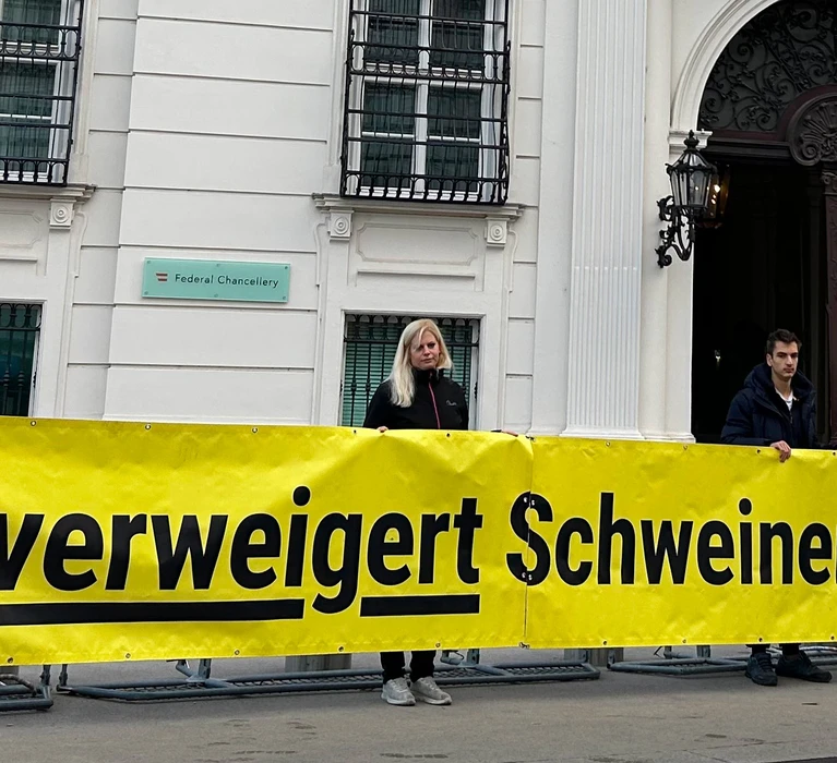 VGT-Obperson DDr. Martin Balluch dazu: „Heute stehen wir vom VGT wieder vor dem Kanzleramt am Ballhausplatz, um die eintreffenden Minister:innen zu ihrer Ministerratssitzung an ihre Verantwortung den Schweinen gegenüber zu erinnern. Auch ein sogenannter strukturierter Vollspaltenboden ist eine schreckliche Tierqual. Die Forschung von Prof. Mandel-Briefer beweist das. Ihre Vokalisationsaufzeichnungen haben bereits gezeigt, wie sehr Schweine auf dem Vollspaltenboden – ob konventionell, unstrukturiert oder neu und strukturiert, den die Regierung ab 2034 bzw. 2038 als neuen Mindeststandard vorschreiben will – leiden. Ganz anders dagegen auf Stroh. Es ist tragisch, dass wieder Jahre verstreichen, bis die Forschung – sowohl jene von Prof. Mandel-Briefer als auch jene vom bereits bewilligten BOKU-Projekt zu den Hubmann-Schweinen – das beweisen wird, was eh selbstverständlich ist: Schweine brauchen eine tiefe Stroheinstreu für wenigstens ein bisschen Lebensqualität. Und das sind wir ihnen schuldig, wenn sie schon millionenfach für die Geschmacksnerven der fleischessenden Bevölkerung gemästet werden.“