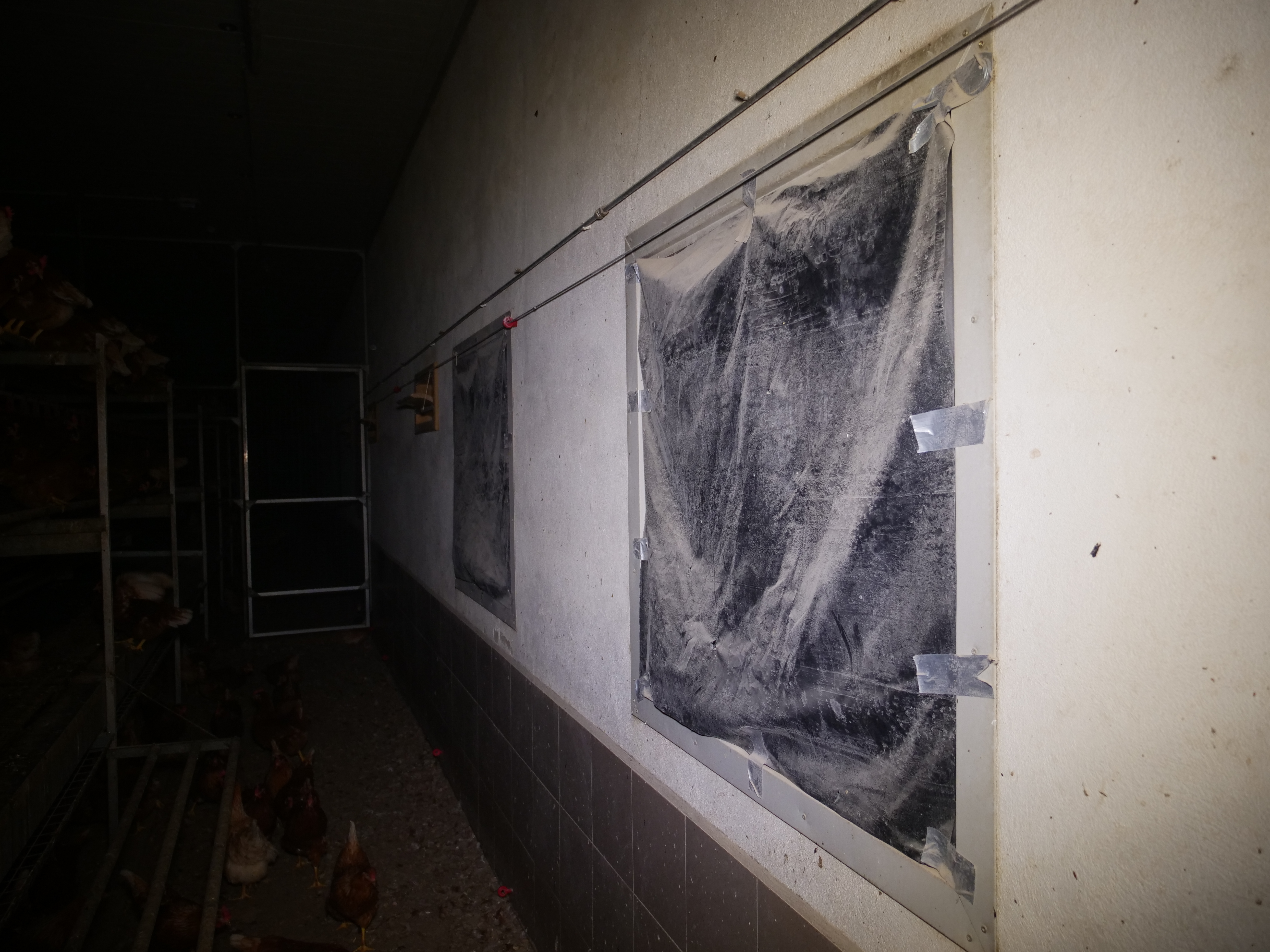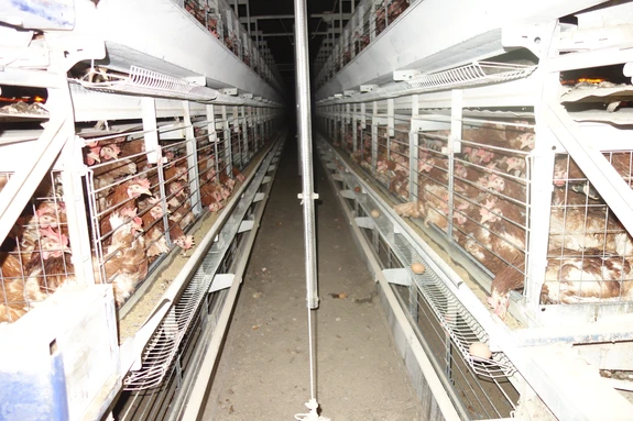 Ein verschließbares System lässt auch im geöffneten Zustand viel weniger Bewegungsfreiheit als ein offenes System zu. Die im Bild sichtbare Form der Bodenhaltung ist in Österreich trotzdem zulässig. Äußerst problematisch ist das, weil bei Kontrollen nicht überprüft werden kann, ob die Gitter dauerhaft geöffnet bleiben.