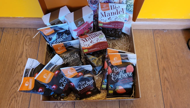 Die Produkte von Landgarten sind 100 % Bio mit regionalen Zutaten aus eigenem Anbau. Wir dürfen 3 Geschenkboxen verlosen, die prall gefüllt sind mit Früchten bzw. Nüssen in Zartbitterschokolade. Egal ob Erdbeeren, Himbeeren, Kirschen, Ingwer oder Mandeln, hier ist für jeden Geschmack etwas dabei! Bio, glutenfrei, fettfrei geröstet.