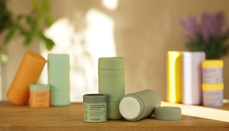 Naloop produziert nachfüllbare Bio-Deos in Papierverpackung. Die Produkte von Naloop sind zu 100 % vegan und tierversuchsfrei, plastikfrei und palmölfrei. Durch das Upcycling von Reststoffen aus der Olivenölproduktion zu einem wichtigen Inhaltsstoff werden Ressourcen geschont.