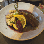 Vegansl mit kräftiger Gemüse-Rotwein Jus, nussig-fruchtiges Maronirotkraut und knusprige Bio-Kartoffelknödelscheiben