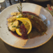 Vegansl aus Selerie mit Kartoffelknödel, Rotkraut und karamellisierten Maroni