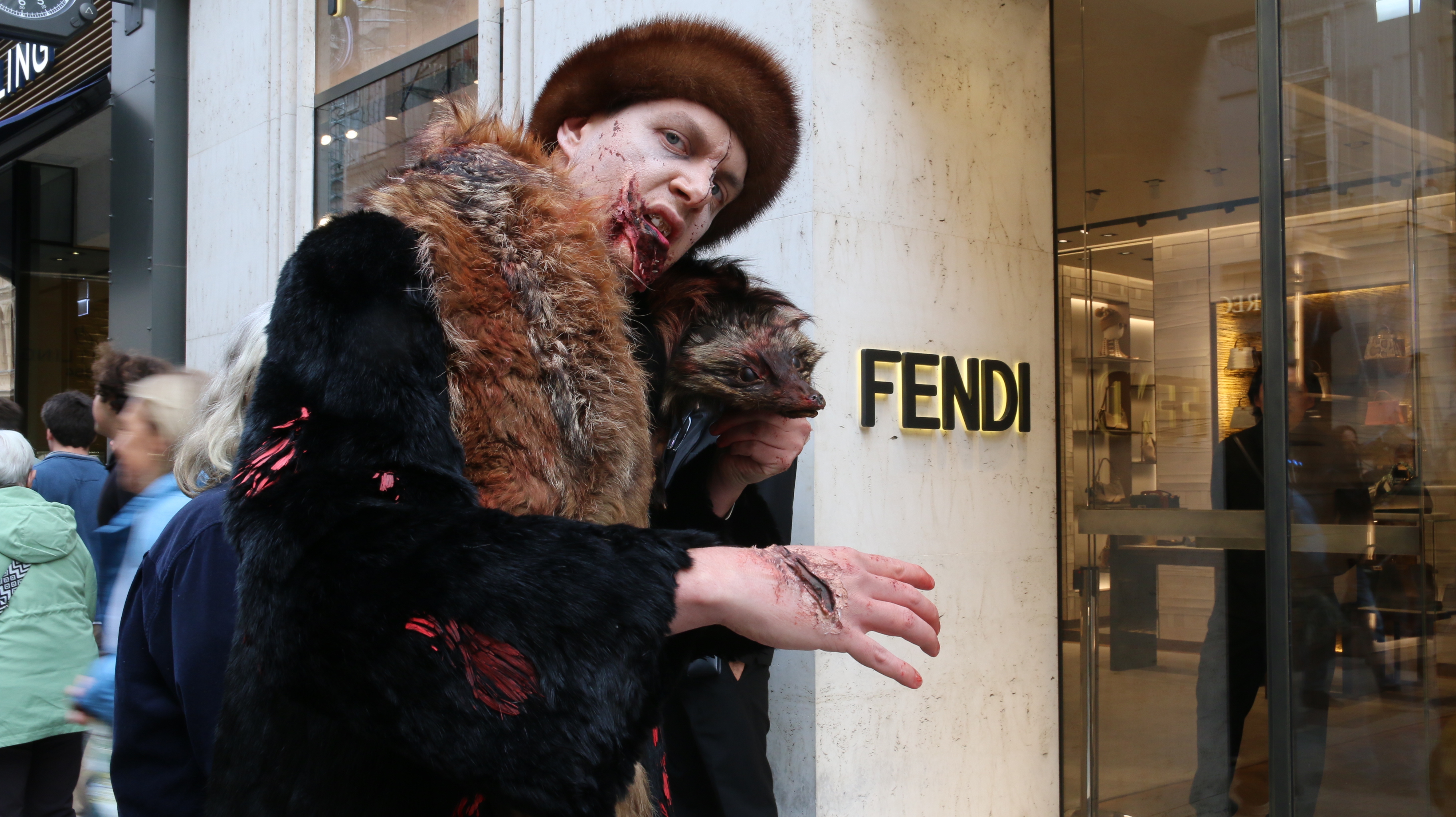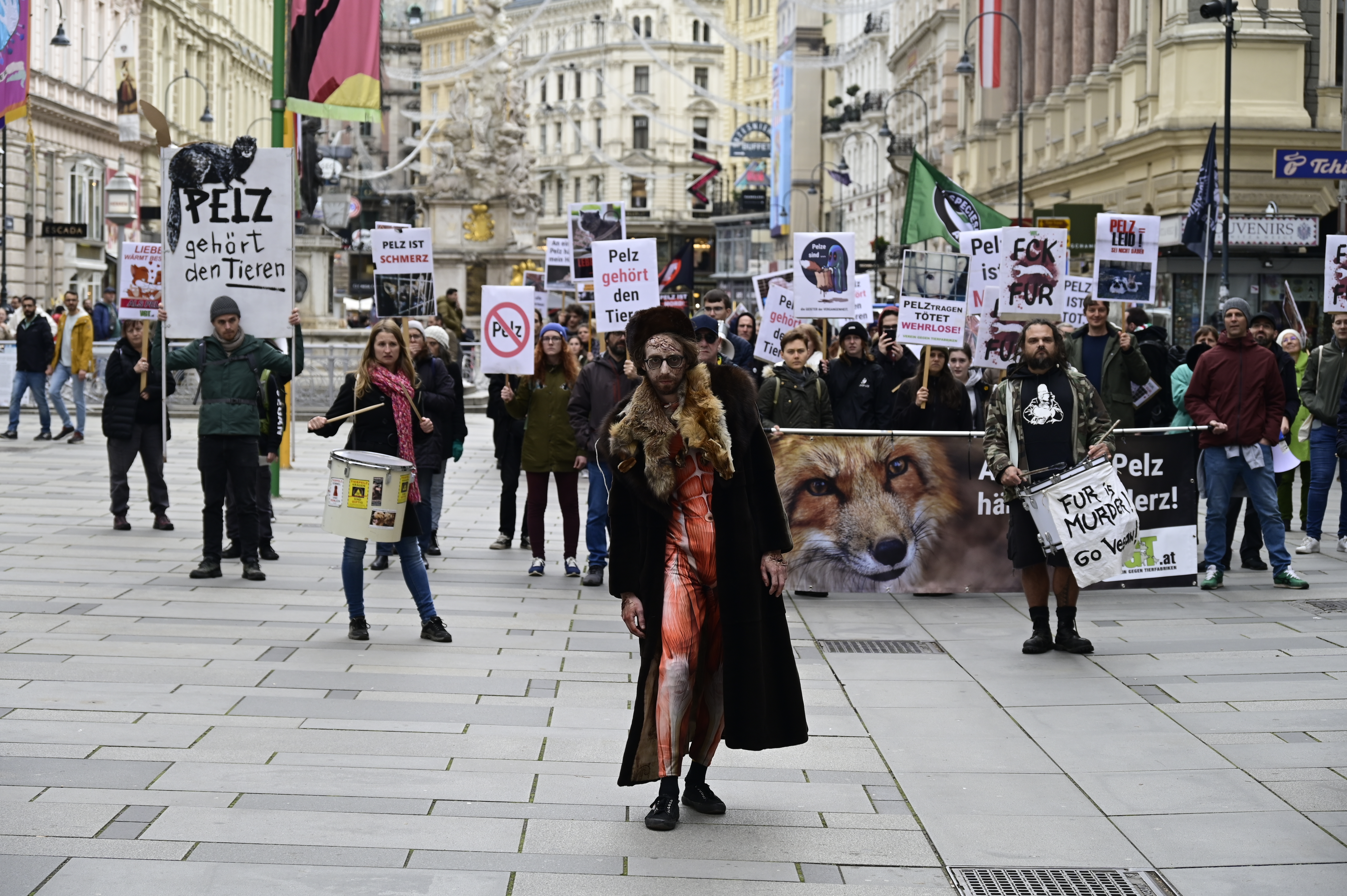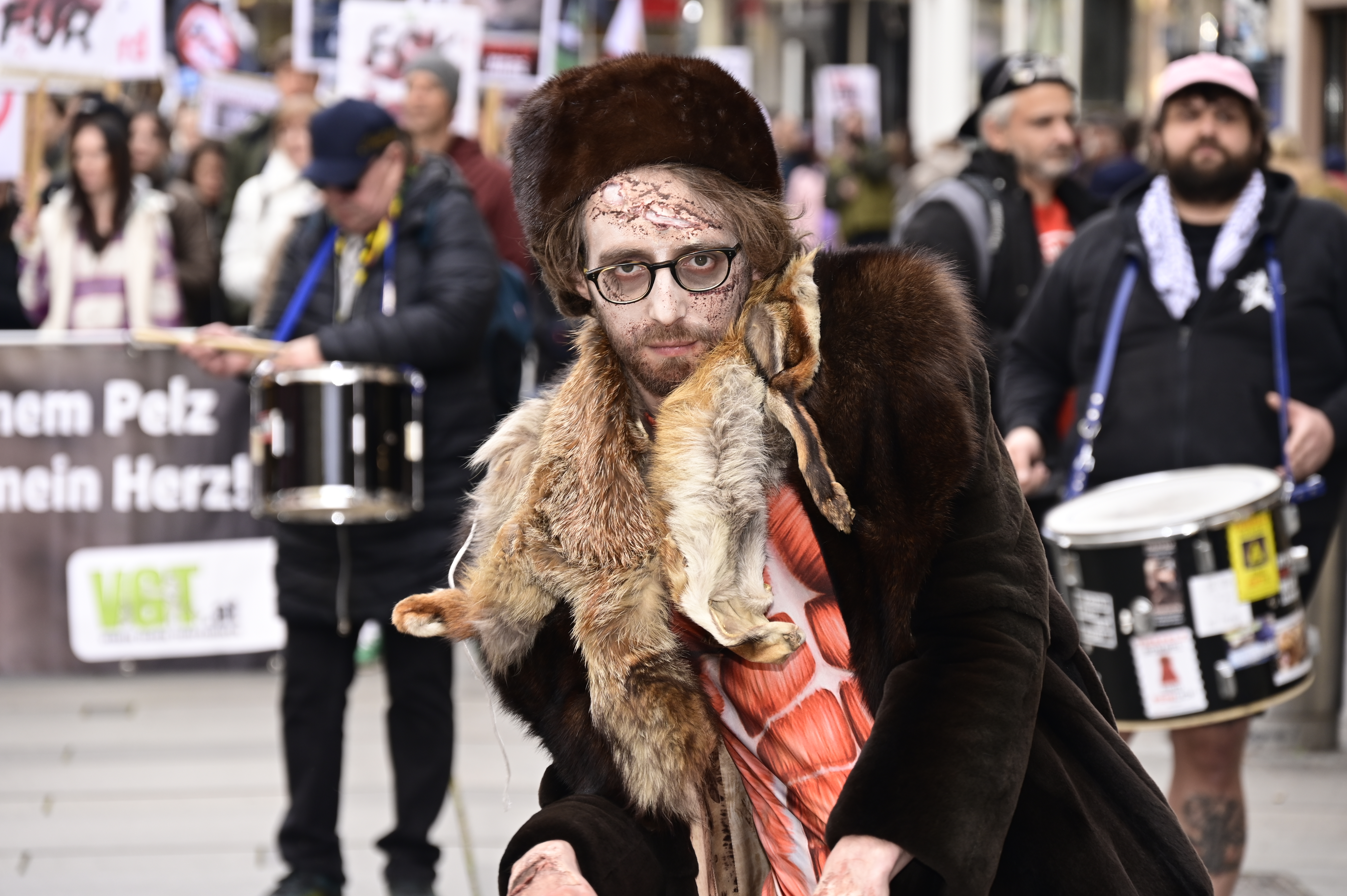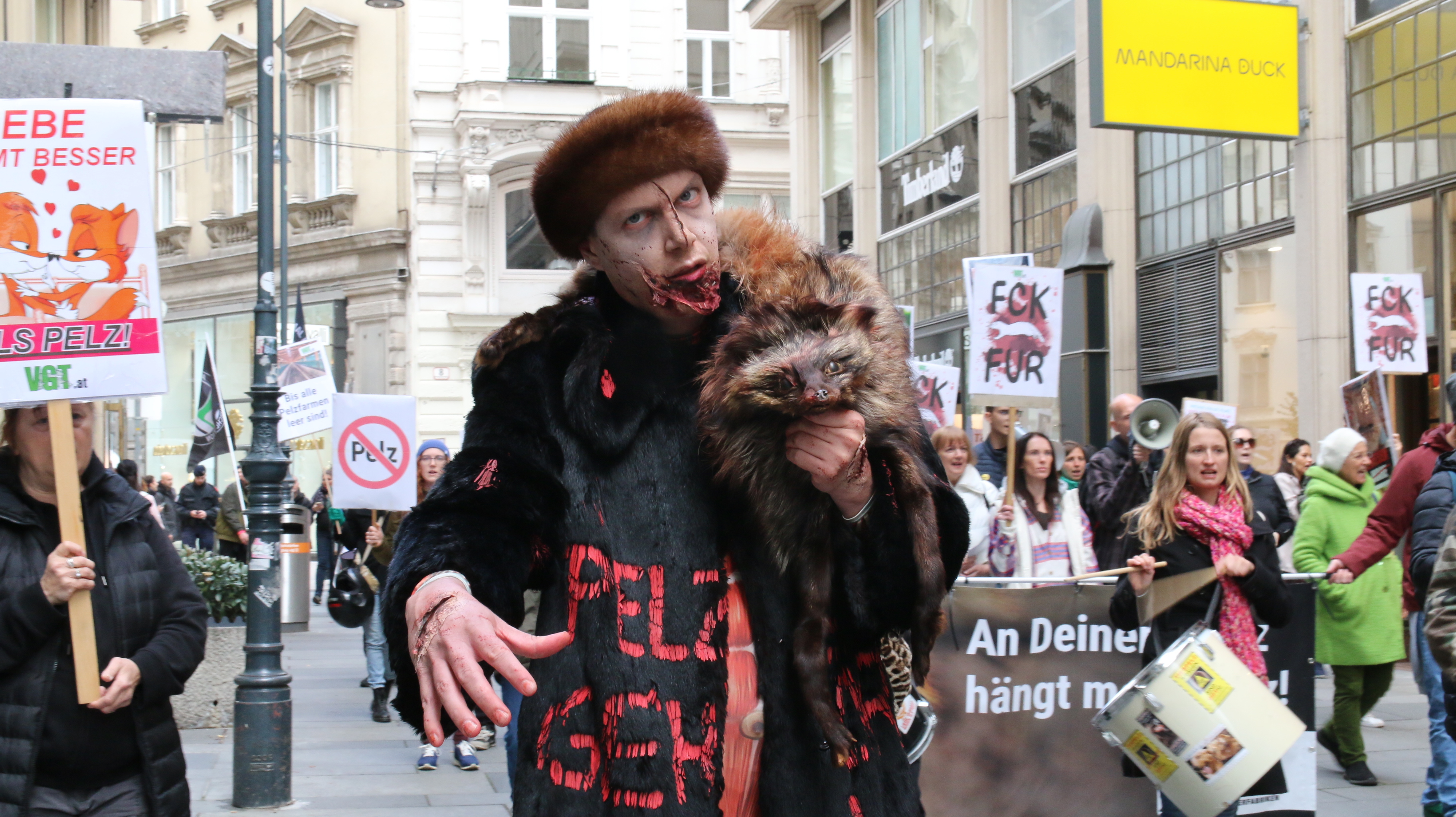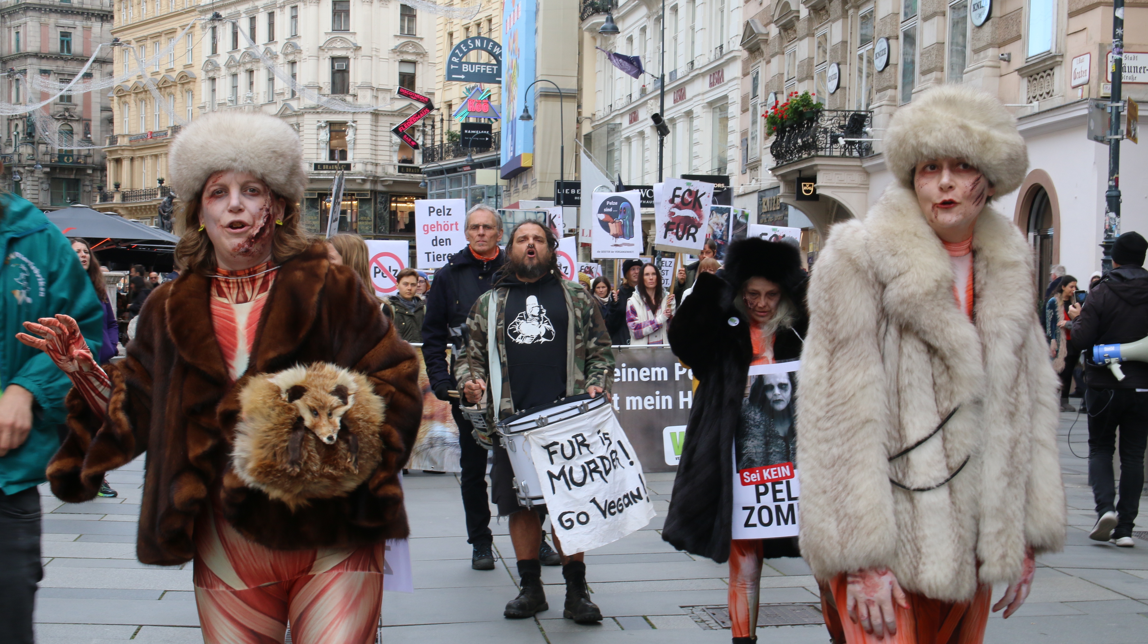 Dieses Jahr waren auch die sogenannten "Pelzzombies" Teil der Demo. Diese schaurige Truppe aus mit gespendeten Pelzmänteln verkleideten Aktivist:innen führte den Demozug an. Vor jedem Pelzgeschäft auf der Route bezogen die Zombies Stellung und brachten zum Ausdruck "Nur Zombies tragen Pelz!". Eine professionelle Visagistin stellte ihre Künste in der Vorbereitung zur Demo zur Verfügung und sorgte für den grusligen Zombie-Look.