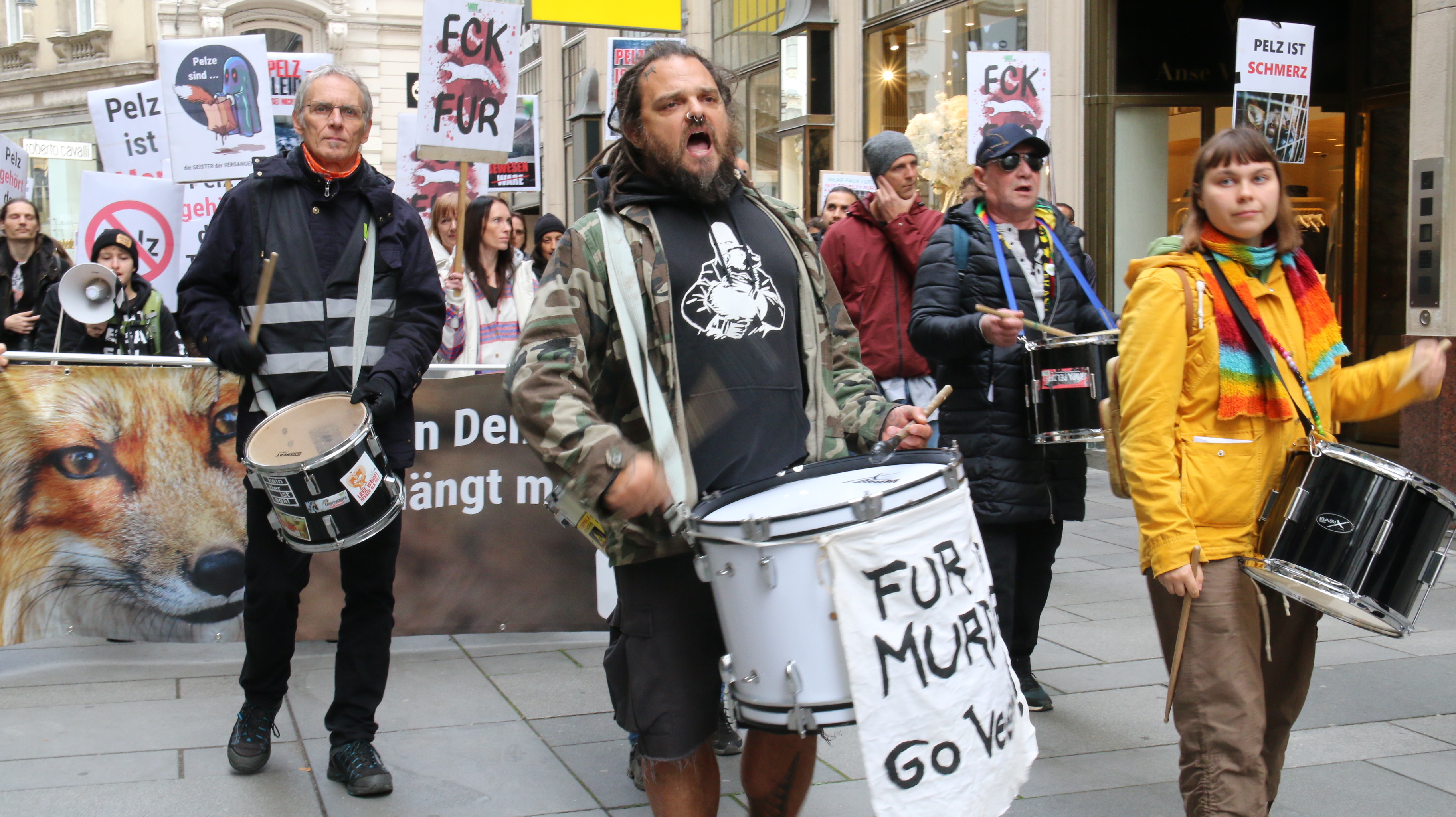 Insgesamt 200 Menschen folgten dem Motto "Bis alle Pelzfarmen leer sind". Mit Parolen, Flugblättern, Schildern und Bannern wurden Passant:innen auf das Leid der Tiere in der Pelzindustrie aufmerksam gemacht. Trommeln gaben den Rhythmus vor und sorgten für eine gute Stimmung.