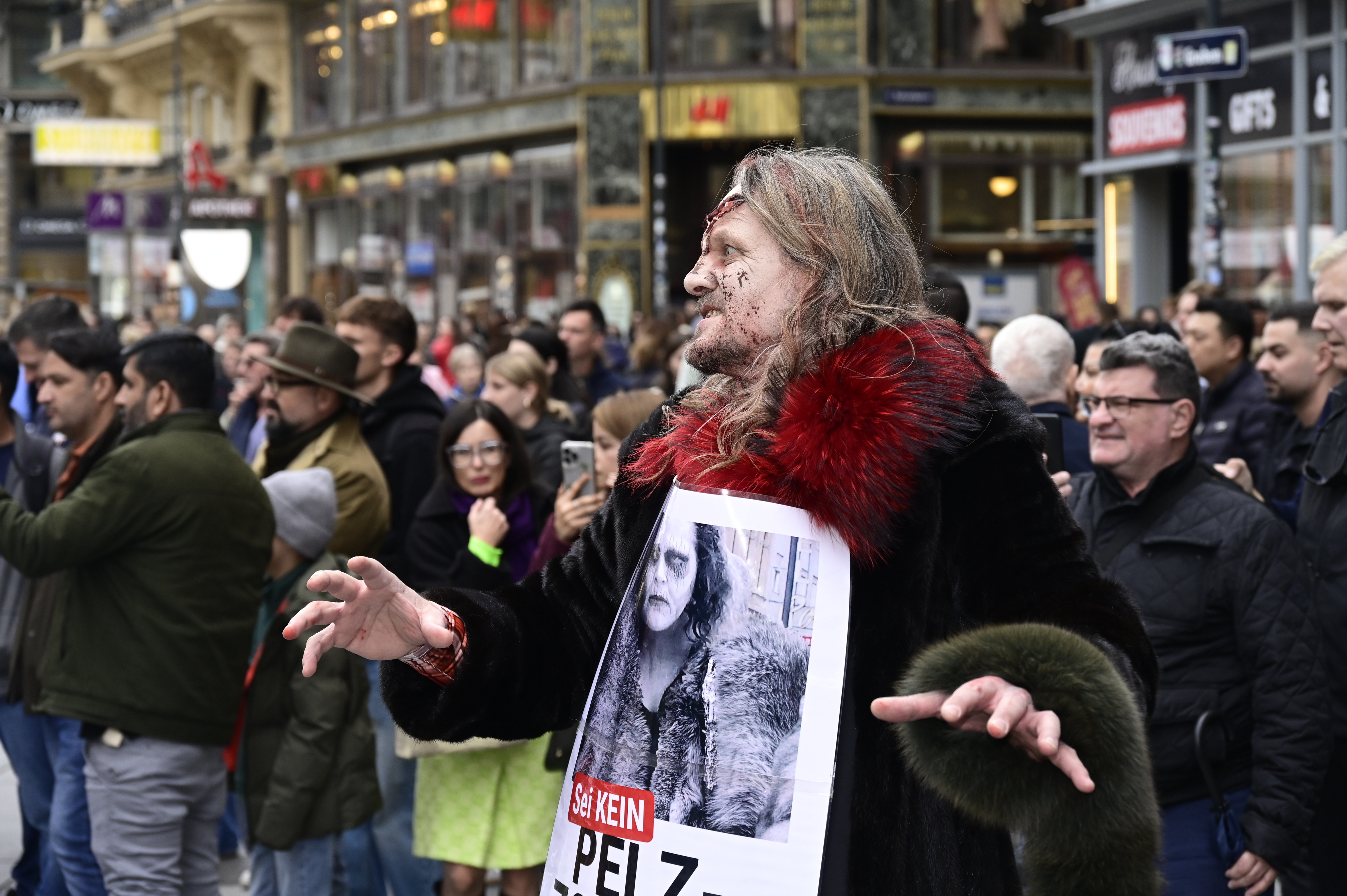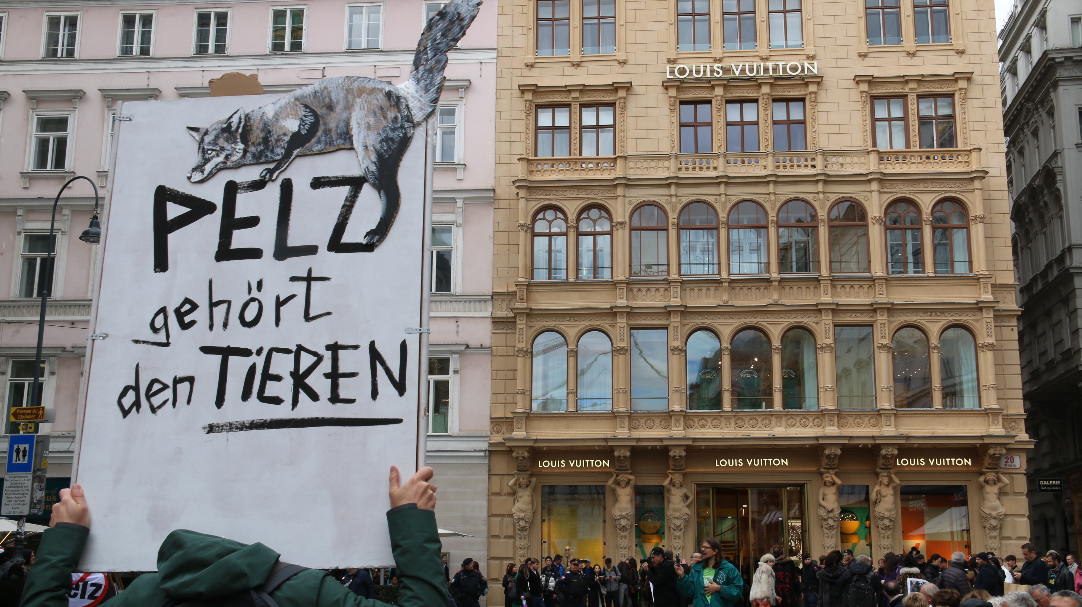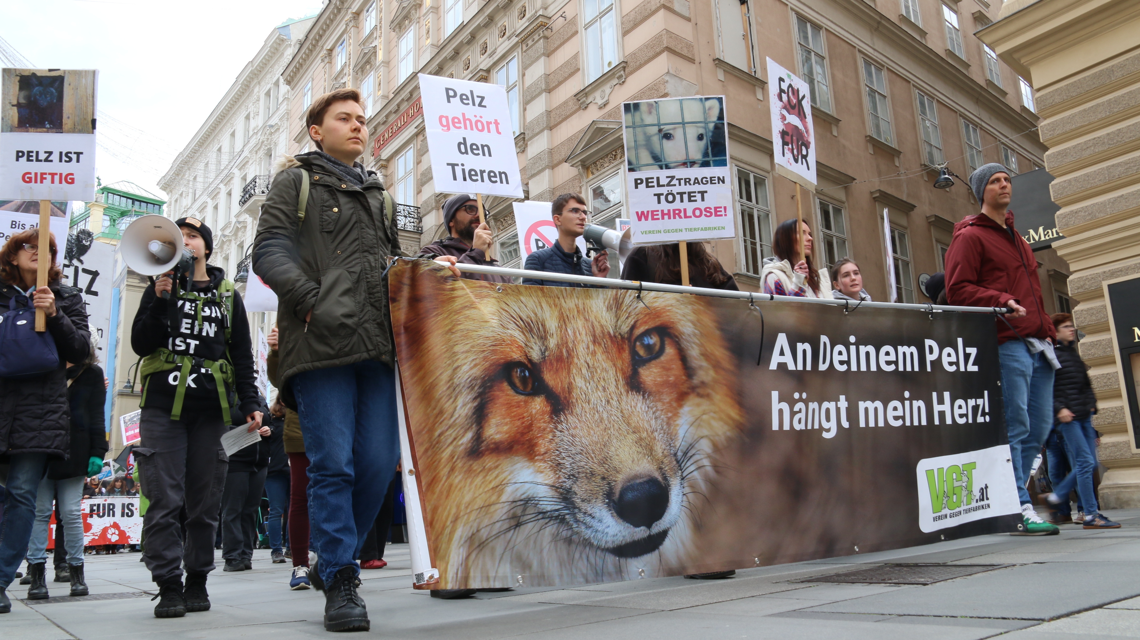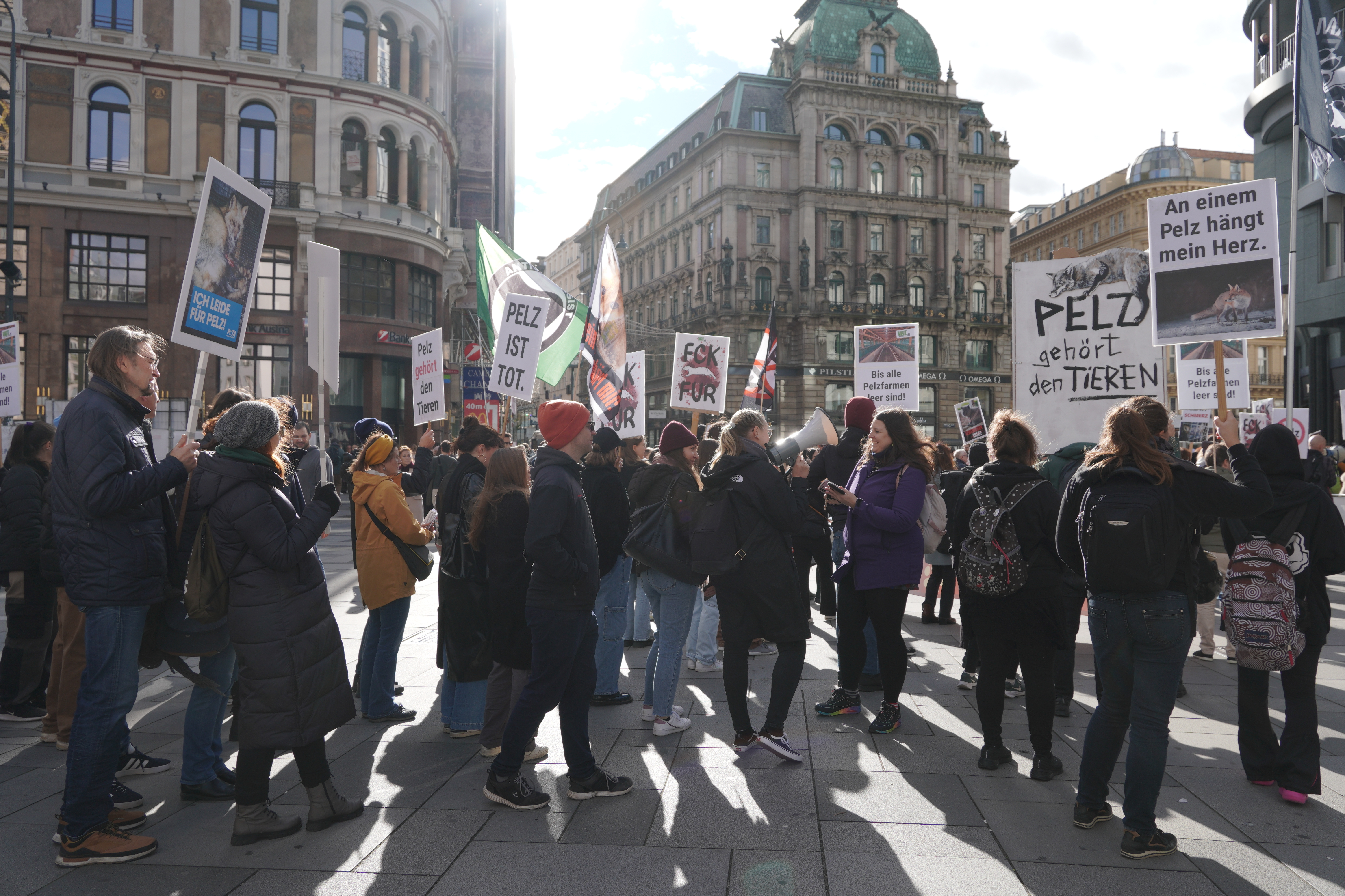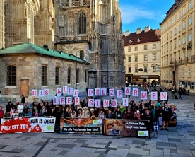 Am Ende hielt VGT-Anti-Pelz-Campaigner Georg Prinz am Michaelerplatz eine emotionale Rede vor versammelter Menge darüber, wie wichtig es ist, ständig am Ball zu bleiben, auch wenn mal etwas schiefgeht, auch wenn es Widerstände gibt: "Am Ende wird es gelingen und wir werden noch miterleben, wie die letzte Pelzfarm schließt und wie das letzte Stück Pelzkleidung aus den Geschäften verschwindet."
