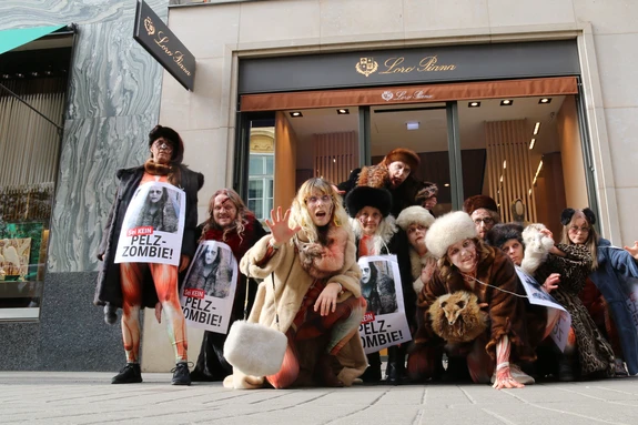 Im Anschluss an die Demo trotzten noch rund 20 Tierschützer:innen dem Regen und demonstrierten eine Stunde lang vor Loro Piana. Loro Piana ist Teil des internationalen Mode-Konglomerats LVMH, dem viele der bekanntesten Luxusmarken der Welt angehören. Eine weltweite Kampagne fordert momentan die LVMH-Marken Loro Piana und Berluti dazu auf, pelzfrei zu werden.