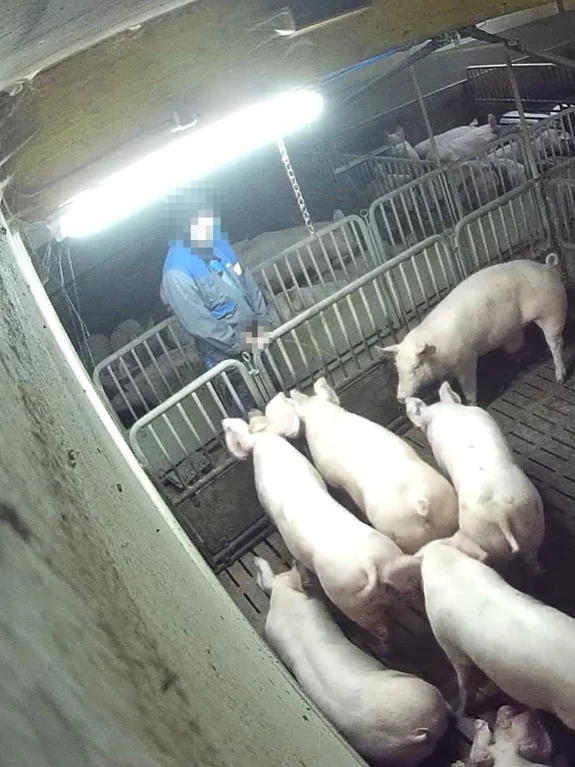 Ein anderer Arbeiter treibt Mastschweine unter Einsatz von schmerzhaften Elektroschocks, sogar wenn die betroffenen Tiere sich aufgrund von verkeilten Schweinen gar nicht weiterbewegen können. Dabei dürfen elektrische Treibgeräte per Gesetz nur in Ausnahmefällen verwendet werden.