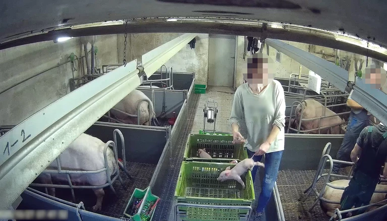 Auch der Umgang mit den Ferkeln ist extrem brutal. Die erst wenige Tage alten Tiere werden teils aus einiger Entfernung in Körbe geworfen, an einzelnen Beinen oder sogar den empfindlichen Ohren hochgehoben und an den Schwänzen gezogen. Auf dem Bild ist erkennbar, dass dieser Umgang dem Ferkel offenbar Schmerzen bereitet.