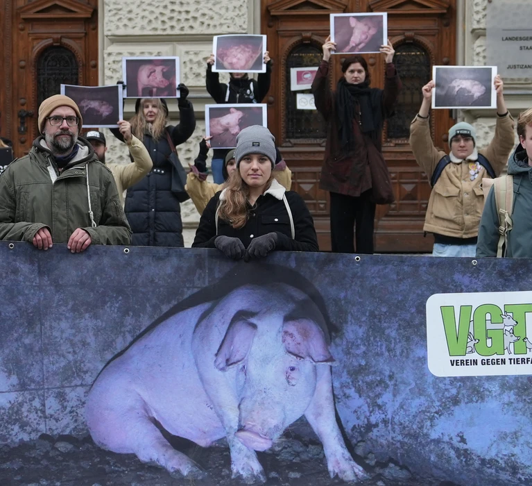 Der heutige Prozesstag am Grazer Landesgericht für Strafsachen brachte ein eindeutiges Urteil, sorgte bei den zahlreichenen Zuhörer:innen aber auch für Verwunderung. Die Angeklagten wurden wegen Tierquälerei und Beweismittelunterdrückung schuldig gesprochen, die Strafhöhe bleibt aber unter den angemessenen Möglichkeiten. Der VGT demonstrierte zu Prozessbeginn vor dem Gerichtsgebäude, um seinen Unmut über diesen Fall schlimmster Tierquälerei und die über die tierquälerische Haltung auf Vollspaltenboden kundzutun.