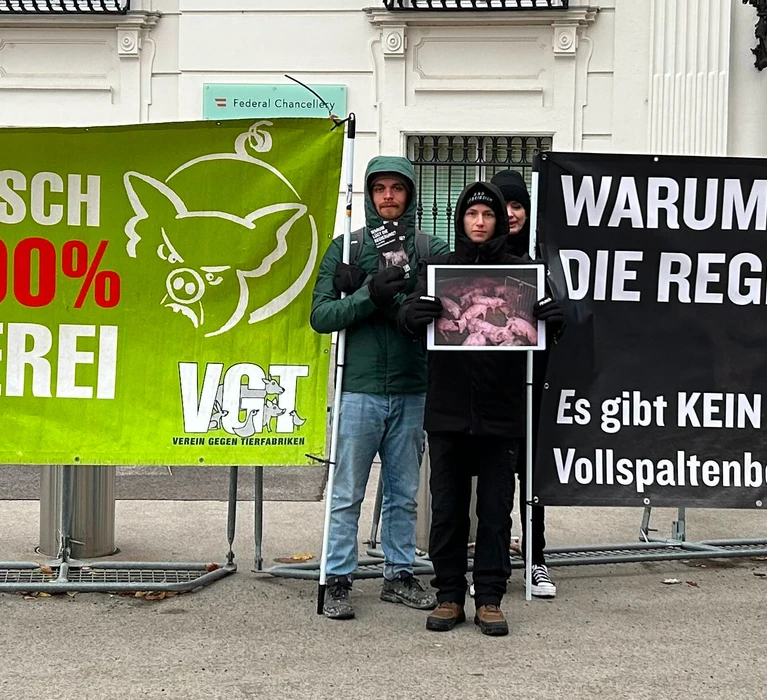 Da ist sie wieder, die mantrahaft wiederholte Ausrede bei jeder weiteren Aufdeckung skandalöser Zustände in Vollspaltenboden-Schweinefabriken durch den VGT: das seien nur schwarze Schafe, 99 % der Landwirt:innen würden dafür sorgen, dass es ihren Tieren gutgehe, die gesetzlichen Standards in Österreich wären vorbildlich und hoch, ja international führend. Man fragt sich nur, warum es dann immer wieder solche Aufdeckungen geben kann! Die Antwort liegt klar auf der Hand: der Vollspaltenboden ist eine reine Tierquälerei, die zwangsläufig zu verletzten und kranken Tieren führt. Der Unterschied zwischen Skandal und „anständiger Schweinefabrik“ ist nur, ob diese kranken und toten Tiere schnell genug entfernt wurden. Der VGT fordert deshalb heute einmal mehr bei einem Protest vor dem Bundeskanzleramt anlässlich des Ministerrats, dass die Regierung bzgl. der Schweinehaltung zu lügen aufhört. Nein, der Vollspaltenboden wurde nicht verboten, auch für 2034/2038 nicht. Ja, der Vollspaltenboden ist eine furchtbare Tierquälerei und damit ist Österreich Schlusslicht in der Schweinehaltung in Europa. Weder sind die gesetzlichen Standards gut oder gar vorbildlich und hoch, noch kann man beim Vollspaltenboden davon sprechen, dass die Landwirt:innen „äußerst verantwortungsbewusst“ dafür sorgen würden, dass es ihren Tieren gut geht. Sie sorgen de facto dafür, dass es ihren Tieren schlecht geht!