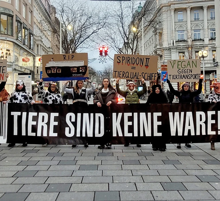 Am Mittwoch, 26.11. Nachmittag demonstrierten Tierschützer:innen vom VEREIN GEGEN TIERFABRIKEN auf der Mariahilfer Straße in Wien für unzählige Tiere, die per Schiff unter widrigsten Bedingungen quer über den Globus verfrachtet werden. Anlassfall ist die Tragödie auf dem Skandalschiff Spiridon II, die sich derzeit abspielt und für eine Riesen-Welle an Empörung quer über den Globus sorgt.