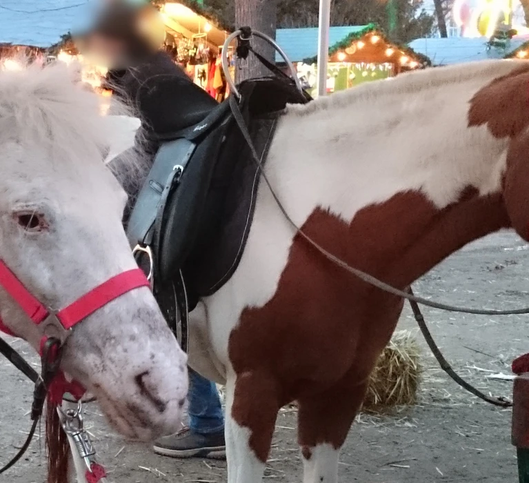 Auch bei Ponys und anderen Pferden ist die Anbindehaltung nach Anlage 1 der 1. Tierhaltungsverordnung jedenfalls verboten. Die Tiere brauchen rutschfeste Böden und eingestreute, trockene Liegeflächen. Ähnlich wie bei den Schafen, ist bei den Pferden der verpflichtende Unterstand nur bei der ganzjährigen Haltung im Freien vorgeschrieben – also nicht zwingend beim Adventmarkt. Wenn Pferde oder Ponys zudem zum Reiten herhalten müssen, ist vom Halter/der Halterin sicherzustellen, dass die Tiere ausreichende Ruhepausen haben und nicht überfordert werden. Kranke oder sonst beeinträchtigte Tiere dürfen nicht für eine solche Arbeit verwendet werden. Leider wird auch das in der Praxis oft nicht beachtet und die Tiere bis zur Erschöpfung und selbst bei Krankheitserscheinungen geritten. Der VGT dokumentiert regelmäßig solche Missstände und bringt sie zur Anzeige. Eigentlich müsste den Tieren in regelmäßigen Abständen Futter und Wasser zur Verfügung gestellt werden, doch das wird von den Betreiber:innen sehr oft vernachlässigt. Dazu kommt, dass die Ponys meist nicht bei den Märkten übernachten sondern via Transporter jeden Tag an- und abgeliefert werden. Die Transporte bedeuten für die Tiere zusätzlichen Stress, und das über mehrere Wochen. Zwischen den Runden, die sie mit Kindern gehen müssen, werden sie angebunden und können sich nicht frei bewegen. Ein Tierschutzproblem, das vom VGT immer wieder angezeigt, aber von den Behörden ignoriert wird.