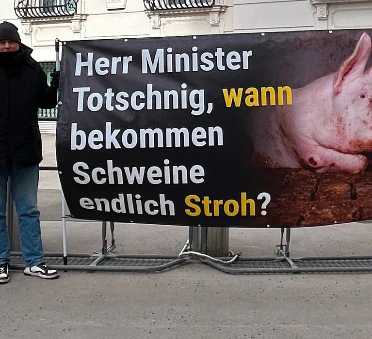 Teilgenommen haben lediglich 8 Mast- und 8 Vormastbetriebe (Ferkelaufzucht), deren Bodengestaltung von Stroheinstreu (1 Betrieb) über Gummimatten bis zur Spaltenreduktion mittels Verschlussklips reichte. In vielen Tierwohlparametern gab es keine signifikanten Unterschiede zum bisherigen Vollspaltenboden, in manchen schnitt der Vollspaltenboden Neu sogar schlechter ab, in manchen marginal besser. Aus Tierschutzsicht ist eines klar: der neue Vollspaltenboden-Mindeststandard ab 2034 bzw. 2038 ist keine Lösung für das Problem, das die Schweine mit diesem Boden haben. Deshalb protestierte heute wieder der VGT am Ballhausplatz in Wien vor der Ministerratssitzung. „Warum lügt die Regierung?“, stand da auf einem Transparent, in Bezug auf die Behauptung, es gäbe ein Verbot des Vollspaltenbodens. Und „Wann bekommen die Schweine endlich Stroh?“, war auf einem anderen zu lesen, weil der neue Mindeststandard ja keinerlei Stroheinstreu vorsieht.