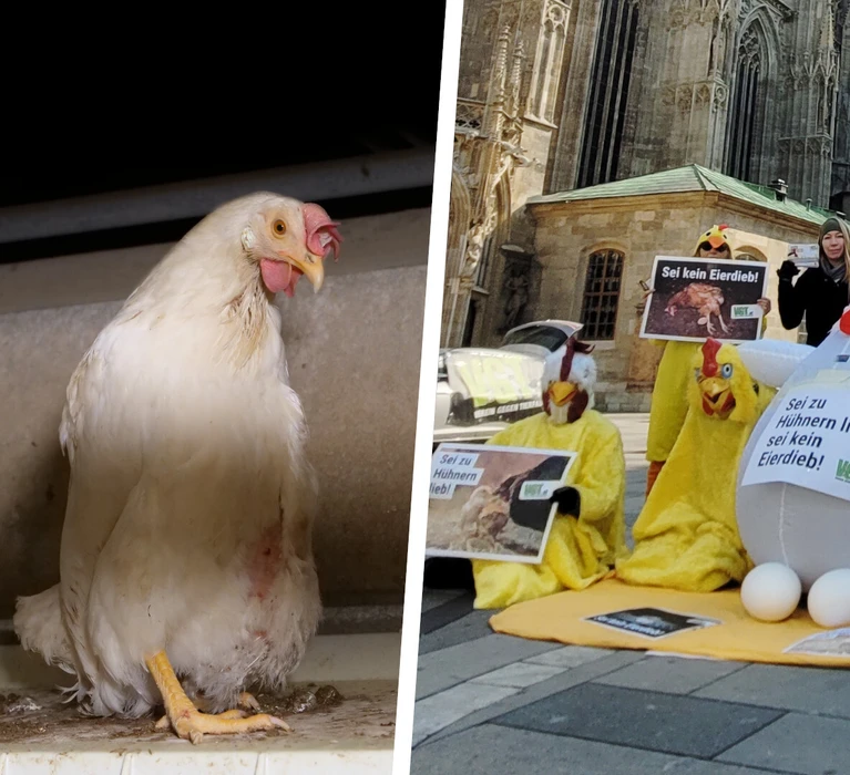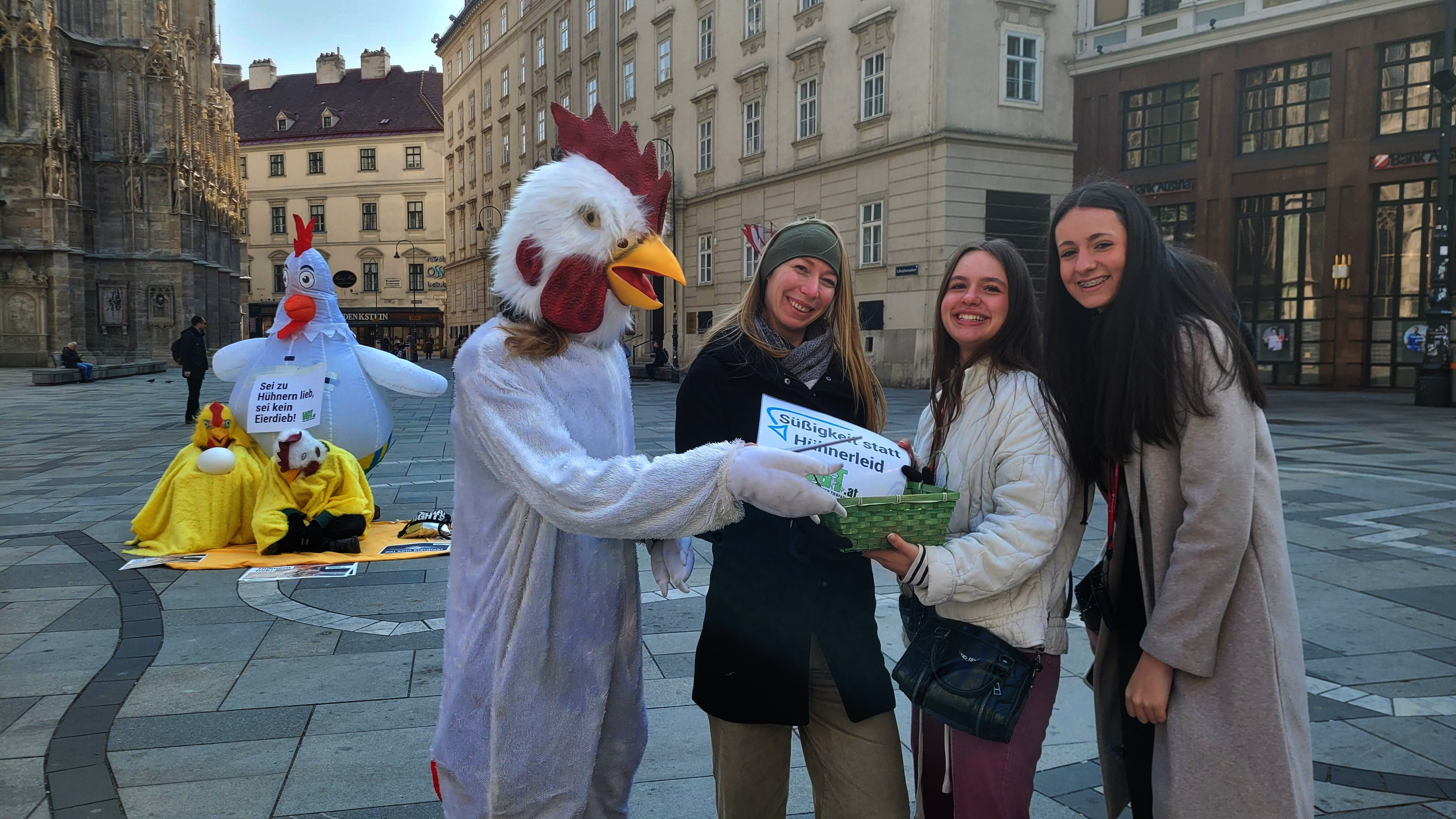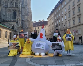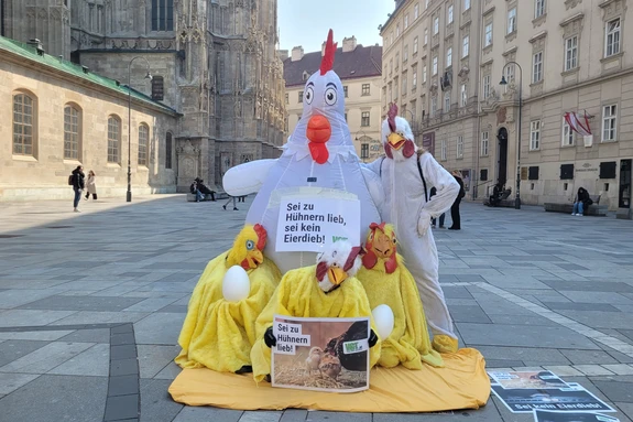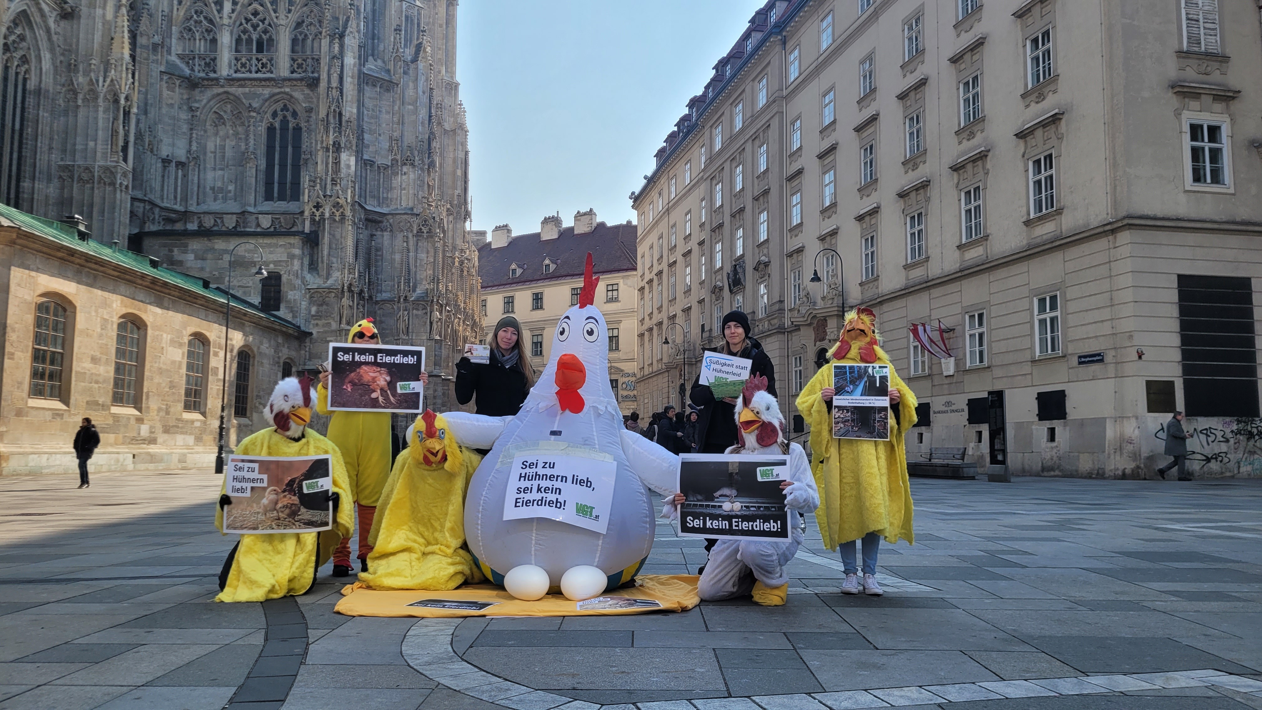 Eine Protestaktion des VGT macht heute am Stephansplatz auf die Missstände in der Eierproduktion aufmerksam.