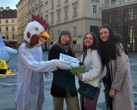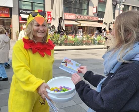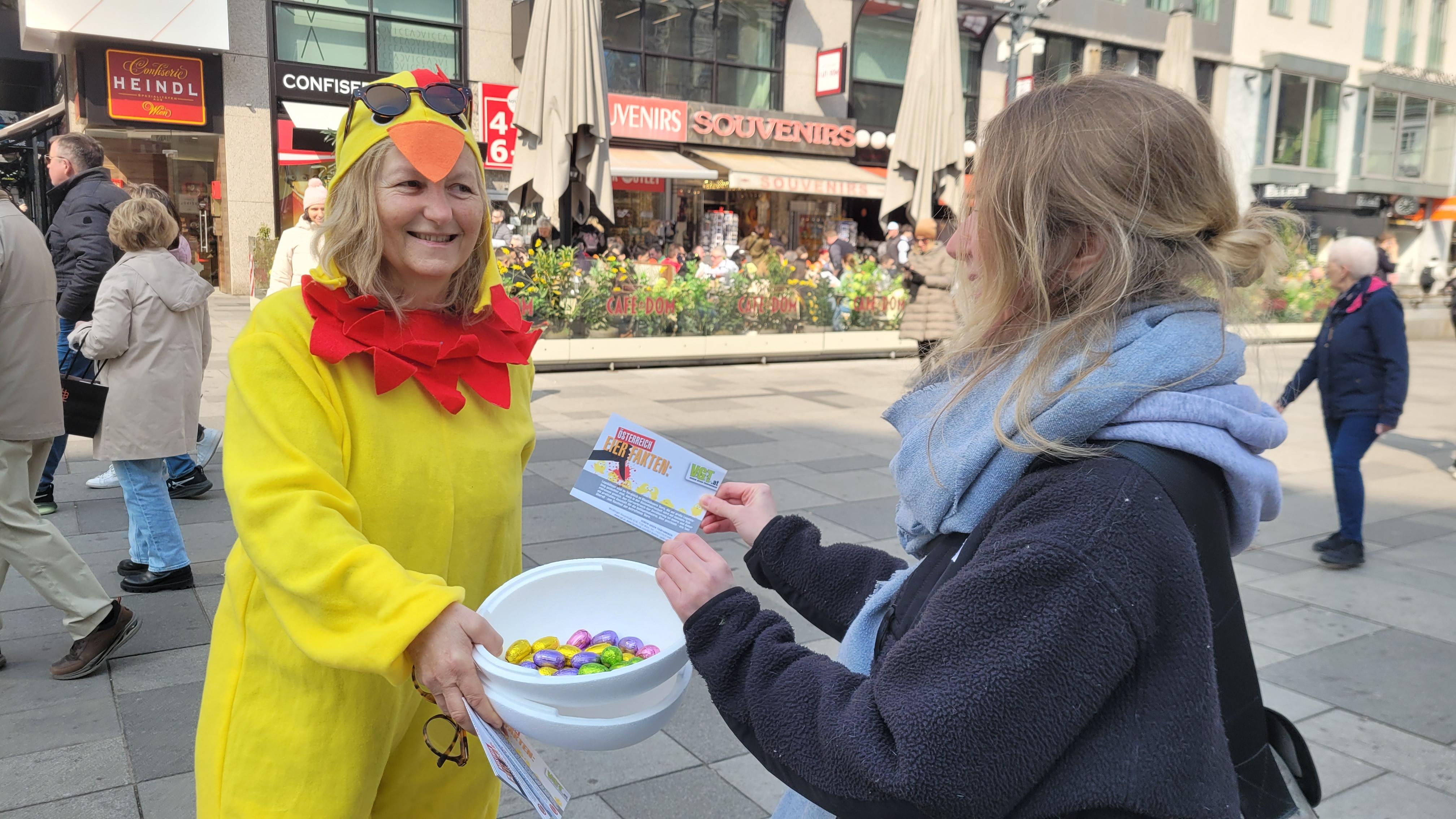 Wien, 18.03.2026, nach dem Motto „Sei zu Hühnern lieb, sei kein Eierdieb“ machen VGT-Aktivist:innen heute am Stephansplatz auf die Missstände in der Eierindustrie aufmerksam. Dazu gesellt sich ein riesiges aufblasbares Huhn, das die Eier im Nest schützen will. „Süßigkeit statt Hühnerleid“ steht auf dem Osterkorb der Tierschützer:innen, aus dem sich Passant:innen vegane Schokoladeostereier nehmen dürfen. Die Aktion folgt der gestrigen Veröffentlichung neuer Aufnahmen aus einem niederösterreichischen Legebetrieb. Der VGT möchte damit Eier-Mythen, die sich hartnäckig in der Gesellschaft halten, aufklären.