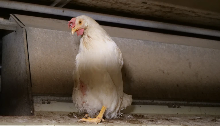 Eine Henne steht gekrümmt in abnormaler Körperhaltung und mit kahler Brust - womöglich ein Hinweis auf typische Krankheitsmuster von Legehennen. Ein Großteil der Legehennen erleidet beispielsweise im Lauf ihres Lebens einen schmerzhaften Bruch des Brustbeins4,5.
