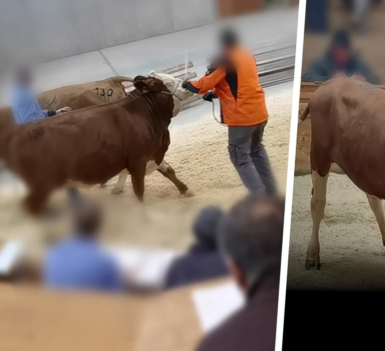 Alle Versteigerungen laufen ähnlich ab: Vor der Veranstaltung werden Rinder und Kälber von ihren Ursprungsbetrieben angeliefert. Am Anfang werden meist Kälber versteigert, dann Stiere und zum Schluss weibliche Rinder. Die ungewohnte Umgebung, eine Fülle an neuen Reizen sowie die Begegnung mit unbekannten Tieren und Menschen kann für die Rinder eine enorme Belastung darstellen. Während der Versteigerung werden sie mit Führseilen in einem Ring vorgeführt und von Handels- und Exportfirmen und Landwirt:innen, die rundherum sitzen, ersteigert. Dieser Part ist oft mit besonders viel Stress verbunden, da alles möglichst schnell gehen muss und oft ein hoher Geräuschpegel herrscht. Gefüllte Publikumsränge können zusätzlich zu einer Reizüberflutung der Tiere beitragen. Die Aufnahmen zeigen einen groben Umgang mancher Rinderhalter:innen mit den sensiblen Lebewesen: Teilweise werden sie mit Stöcken getrieben oder an Seilen herum gezerrt. Vereinzelt wird wehrhaften Tieren sogar mit einem Stock ins Gesicht geschlagen oder der Schwanz verdreht, was zu erheblichen Schmerzen und sogar Wirbelschäden führen kann und illegal ist. Stiere werden üblicherweise durch Schmerzen gefügig gemacht, indem sie an einem Nasenring durch den Ring gezogen werden.