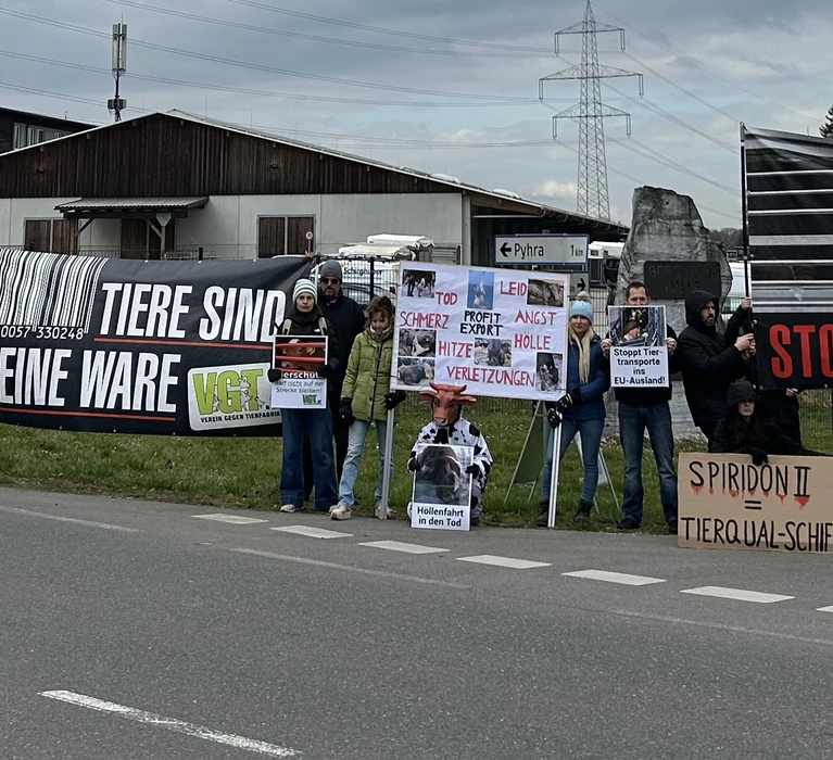 Heute findet in der Berglandhalle im Bezirk Melk eine Versteigerung von Rindern – darunter auch schwangere „Kalbinnen“ aus Milchbetrieben – statt. Tierschützer:innen des VGT versammelten sich zu diesem Anlass vor der Halle, um gegen tierschutzwidrige und riskante Transporte in Drittländer wie Algerien zu demonstrieren.