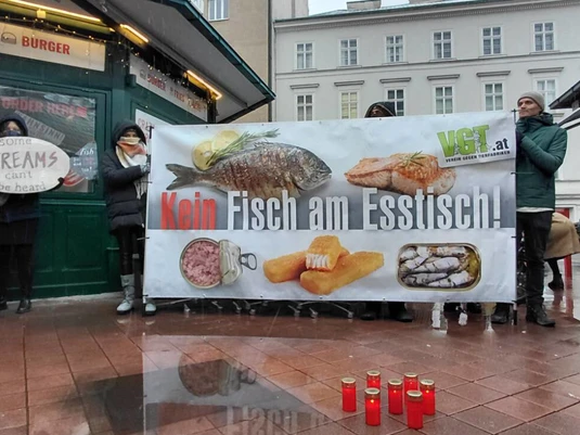 Der VGT informierte bei mehreren Kundgebungen über die Tierschutzprobleme bei der Fischerei. Aktueller Anlass ist der Welttag für das Ende der Fischerei, der heuer am Samstag, 30. März stattfindet.